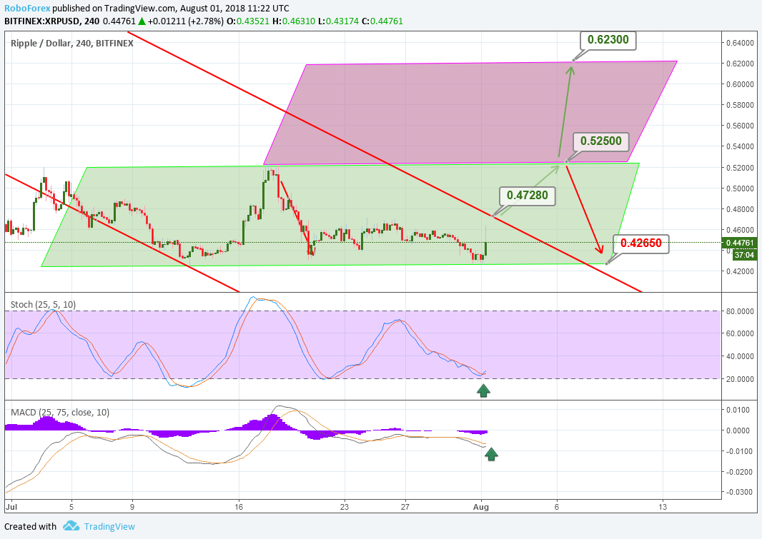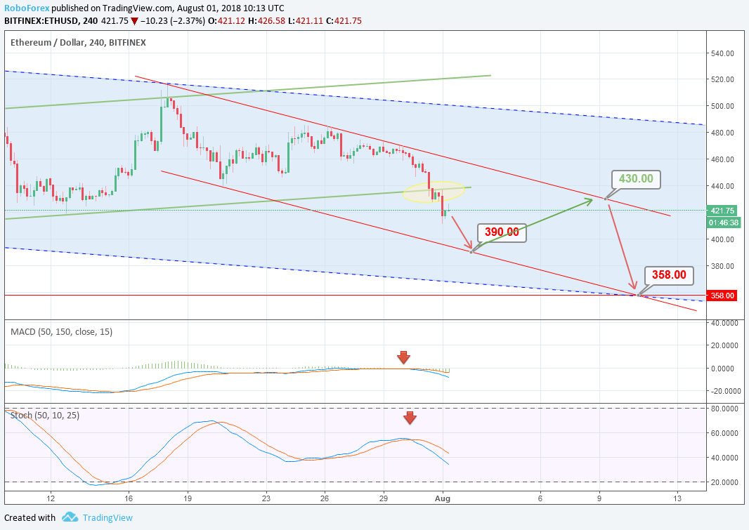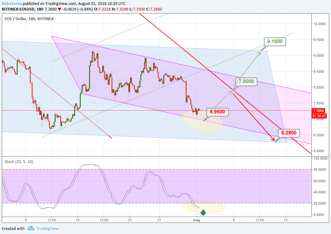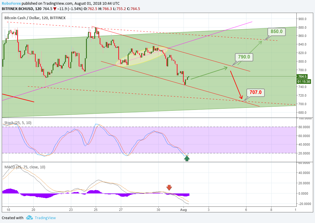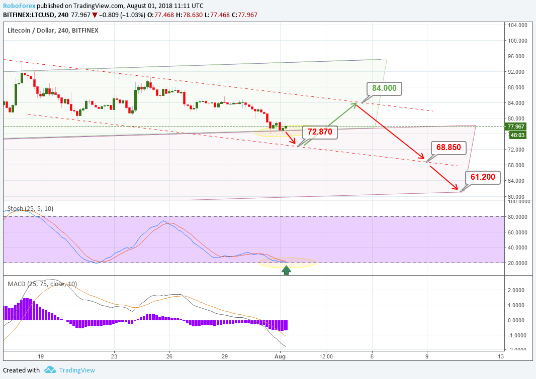 Анализ цен альткоинов: тучи сгущаютсяОпубликовано: 7 лет назад Оценив динамику криптовалют за последние несколько недель, можно констатировать продолжение развития коррекционного «боковика» по основным инструментам. Вскоре эта ситуация может измениться и, преодолев уровни поддержки, котировки криптовалют снова начнут формировать импульсы снижения, считает ведущий аналитик RoboForex Дмитрий Гурковский. Некоторые более волатильные инструменты при этом будут снижаться быстрее, а другие — медленнее. Многое указывает на то, что говорить о развороте долгосрочных тенденций пока рано. EthereumEthereum на 4-часовом графике демонстрирует преодоление линии поддержки коррекционного канала, что может говорить о продолжении развития долгосрочного нисходящего тренда. Истинность пробоя была подтверждена формированием «Черных крестов» на MACD и Stochastic. Ближайшей целью развития импульса снижения может стать линия поддержки краткосрочного нисходящего тренда и отметка $390. После этого наиболее вероятным может стать откат к линии сопротивления для фиксации позиций и тестирования преодоленной ранее зоны поддержки. Целью отката будет уровень $430. Отскок от уровня сопротивления позволит рынку развить импульс снижения не просто к линии поддержки, а к долгосрочному фрактальному уровню $358. Дальнейшее поведение и решения участников рынка вблизи этого уровня может сформировать среднесрочный «боковик» в ожидании какой-либо новой фундаментальной информации. Bitcoin CashРассматривая техническую картину Bitcoin Cash на 2-часовом таймфрейме, можно увидеть, что рынку удалось лишь протестировать линию сопротивления коррекционного коридора. Отбившись от нее, котировки сумели протестировать область локальной фрактальной поддержки, что может являться фактором, указывающим на «медвежьи» настроения рынка. В поддержку «медвежьих» настроений выступило снижение линий MACD в отрицательную зону и формирование нисходящего канала краткосрочного тренда. Но, если взглянуть на Stochastic, то увидим «Золотой крест» в области «перепроданности», что может говорить о возможности отката в ультра-краткосрочной перспективе. Его цель может быть расположена на линии сопротивления краткосрочного нисходящего тренда у отметки $790. В случае пробоя сопротивления рынок продолжит развитие коррекционного «боковика», а котировки смогут подняться до уровня $850. Но при отскоке стоит ожидать новый импульс снижения к локальной линии поддержки — уровню $707. Далее рынок нацелится на тестирование среднесрочной линии поддержки. EOSКотировки Eos на 3-часовом таймфрейме по-прежнему заключены в рамки коррекционного коридора. Вместе с этим конструкция нового краткосрочного нисходящего тренда нацелена на уровень поддержки $6,28, пробой которого подтвердит продолжение развития долгосрочной нисходящей тенденции. В краткосрочной перспективе можно ожидать снижение к локальной линии поддержки на уровне $6,95 с последующим откатом к линии сопротивления — уровню $7,90. Подтверждением данной гипотезе будет формирование «Золотого креста» на Stochastic. Исключать возможность пробоя линии сопротивления и роста котировок к уровню $9,16 также нельзя, поэтому за ситуацией необходимо постоянно следить и корректировать диспозицию. LitecoinТехническая картина Litecoin демонстрирует формирование нового канала нисходящего тренда вн