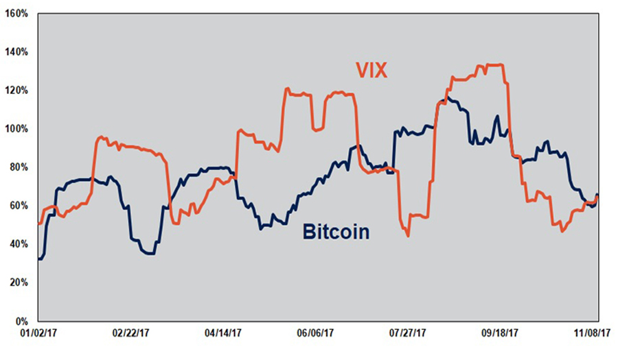 По мнению президента компании Equity Armor Investments Брайана Статленда (Brian Stutland), индекс волатильности CBOE (VIX), также называемый «индексом страха», который отражает ожидания рынка в отношении будущей волатильности, повторяет движения курса биткоина с опозданием в 1 месяц. Статленд заявил: «Очевидно, что индекс VIX и биткоин коррелируют с разницей приблизительно в 30 дней. Можно сказать, что криптовалюты становятся своеобразным способом избавления от кредитных рисков в банковской индустрии». Известно, что большинство криптовалют не регулируются, что позволяет инвесторам вывести свои деньги из банков и таким образом устранить связанные с ними кредитные риски. Несмотря на высокую волатильность биткоина, игроки на традиционных рынках используют его как безопасный актив против колебаний фондовых рынков.