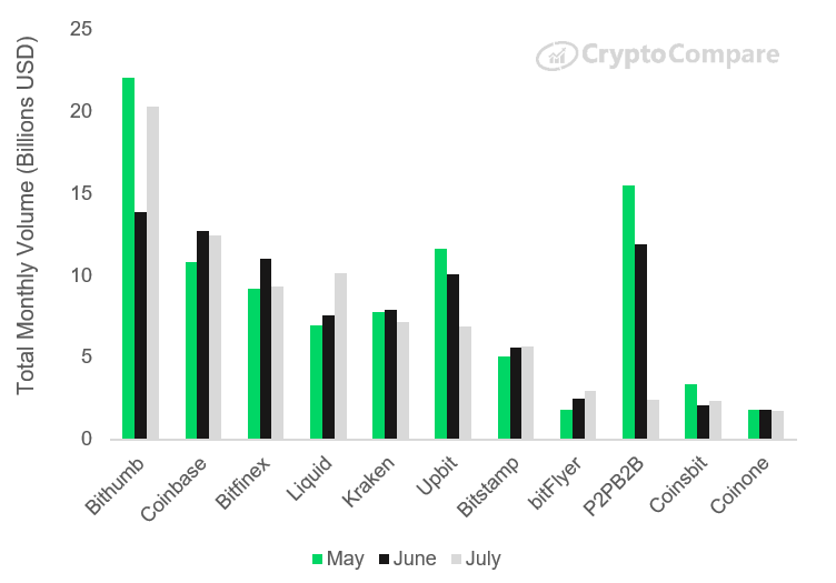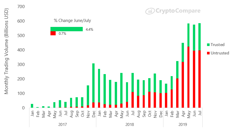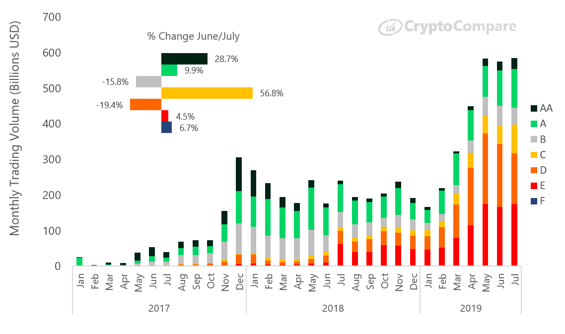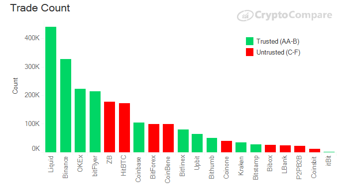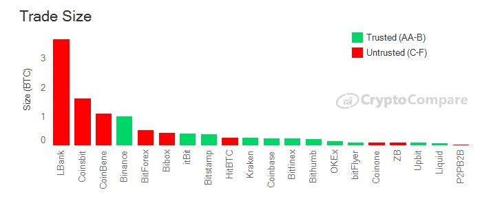 Исследование: в июле объем торгов на «сомнительных» криптовалютных биржах превысил $300 млрдОпубликовано: 6 лет назад Несмотря на то, что имеющие репутацию надежных биржи нарастили за последнее время торговые объемы, на рынке по-прежнему продолжают доминировать сомнительные торговые площадки, чьи подходы к соблюдению требований регуляторов и обеспечению безопасности пользователей далеки от предъявляемых стандартов. Такой вывод содержится в последнем исследовании аналитического портала CryptoCompare. Так, согласно недавно запущенной рейтинговой системе Exchange Benchmark, в июле торговые объемы бирж категории AA по сравнению с предыдущим месяцем выросли на 29%. В общей сложности на них пришлось 5% совокупного объема ($31 млрд), для бирж категории A и B эти показатели составили 19% ($119 млрд) и 8% ($47 млрд) соответственно. В то же время совокупные торговые объемы бирж категории D и E составили 64% ($316 млрд). В целом, объемы торгов на «доверенных» биржах (категории AA-B) выросли в июле на 4,4%, в то время как для бирж из категорий C-F прирост составил всего 0,7%. Совокупный объем на доверенных биржах составил тем не менее только одну треть (32%) от всего рынка. Среди бирж категорий C-F самые крупные средние размеры заключаемых сделок оказались на LBank, Coinsbit и CoinBene — 3.7, 1.6 и 1.1 BTC соответственно. Примечательно, что на LBank (категория D) средний размер сделок в паре BTC/USDT оказался в 15 раз выше, чем в паре BTC/USD на ведущей американской бирже Coinbase (категория AA). С точки зрения количества заключаемых ежедневно сделок, на LBank эта цифра составила 25 тысяч в паре BTC/USDT против 100 тысяч в паре BTC/USD на Coinbase. Лидерами по числу заключаемых ежедневно сделок в июле стали Liquid (более 400 тысяч) и Binance (более 300 тысяч). Более 200 тысяч сделок заключалось на OKEx и BitFlyer. Также исследование показало, что крупнейшей по объемам торгов крипто-фиатной биржей с показателем в $20,4 млрд оказалась Bithumb. При этом южнокорейская платформа продемонстрировала впечатляющие темпы роста – за июль ее объемы выросли 46,4%. Идущие на втором и третьем местах Coinbase ($12,5 млрд) и Bitfinex ($9,35 млрд) торговые объемы, наоборот, подрастеряли: минус 2% и 15,2% соответственно. В то же время на биржи, где торги идут исключительно в криптовалютных парах, пришлось 84% совокупного торгового объема ($497 млрд). У бирж с поддержкой фиата этот показатель составил 16% ($93 млрд). Эти данные согласуются с показателями двух предыдущих месяцев. Напомним, ранее аналитики DataLight сообщили, что по отношению к максимумам 2017 года объемы торгов биткоином в первой половине 2019 выросли в 1,5 раза. Последние новости рынка криптовалют |