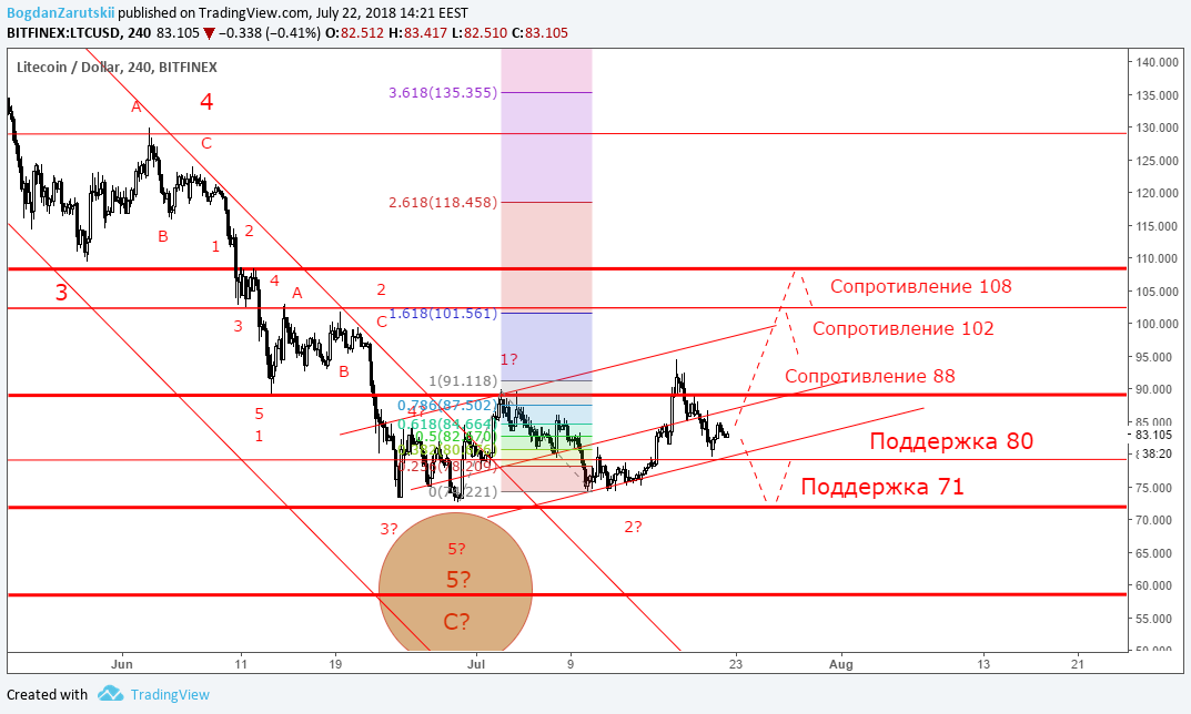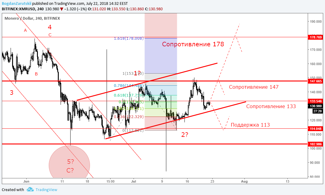 LTC/USD H4: возле сопротивленияЛайткоин (LTC) не смог дойти до поддержки на уровне $70-$71, но вместе с тем график цены находится в рамках восходящей тенденции. С точки зрения технического анализа, это положительный сигнал, поскольку у трейдеров еще остается интерес дальше покупать. Таким образом, в случае новой волны роста откроется перспектива достижения сопротивления в районе $88. После пробоя первого уровня ($88) в центре внимания будет движение «цифрового серебра» до следующего уровня в районе $102. Что касается волновой теории Эллиотта, то последний минимум выше предыдущего, что говорит о развитии следующей волны. Кроме того, основание тренда в виде импульсной волны 1 и коррекционной волны 2 сформировано, и технически это является дополнительным сигналом на рост. Поэтому пробой ключевого сопротивления в районе $88 и пробой максимума прошлой недели даст сигнал на дальнейшее развитие импульса роста. XRP/USD H4: в боковикеРиппл (XRP) технически оказался хуже лайткоина, но радует то, что график цены не ушел ниже важного уровня поддержки в районе $0.4245. Кроме того, виден небольшой отскок в рамках спекулятивной торговли, и технически это намекает на рост до ближайшего сопротивления в районе $0.5045. C другой стороны, видно, что риппл по-прежнему находится в рамках торгового диапазона $0.4239 – $0.5045. Данная ситуация пока не внушает быкам уверенности. Как только будет выход за граничное значение в районе $0.5045, тогда можно говорить о новой фазе роста, в том числе и с точки зрения волновой теории Эллиотта. Негативный сценарий для риппла, в случае плохого новостного фона - это пробой поддержки в районе $0.4239. Тогда можно говорить о дальнейшем движении по направлению нисходящей тенденции. XMR/USD H4: сильная трендовая поддержкаМонеро (XMR) выглядит более интересным с точки зрения технического анализа. График цены формирует восходящий канал, таким образом открывается уверенная цель, куда монеро может дойти - это сопротивления в районе $147. В случае пробоя этого уровня будет закрепление в более высоких торговых рамках $178 - $147. Кроме того, поддерживают рост импульсная волна 1 и корекционая волна 2. С точки зрения волнового анализа, в перспективе развитие импульсной волны 3. Также стоит обратить внимание на Растяжение Фибоначчи - его уровни совпадают с такими важными значениями для монеро как $147 и $178. Последние новости рынка криптовалют |