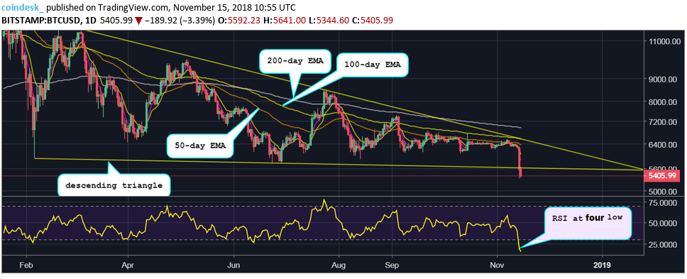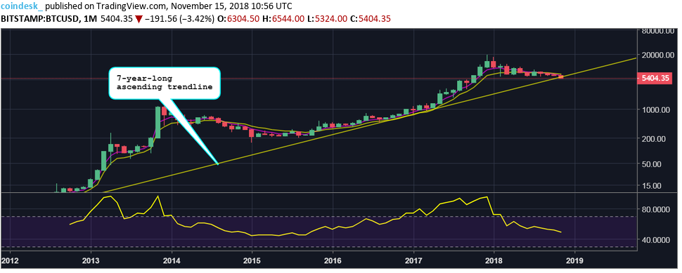 Мнение: в ближайшие дни биткоин закрепится на отметке $5000Опубликовано: 7 лет назад В течение ближайших дней цена первой криптовалюты найдет поддержку на отметке $5000, допускает аналитик CoinDesk Омкар Годбоул. После достижения самых низких за 13 месяцев отметок, цена биткоина пребывает в глубокой перепроданности. Средневзвешенный курс первой криптовалюты снизился более чем на 10%, что стало одним из самых сильных падений внутри дня в этом году. В настоящее время «дед» торгуется в районе $5400 на бирже Bitstamp. Цена соответствует значениям октября прошлого года. Уверенное пробитие ключевого уровня поддержки на отметке $6000 говорит о возобновлении распродаж, продолжающихся с конца декабря прошлого года, после того, как был достигнут исторический максимум вблизи отметки $20 тысяч. Весьма вероятно продолжение нисходящего движения цены. Однако индекс относительной силы (RSI) указывает на некоторое ослабление давления со стороны продавцов. Дневной графикКак видно на графике, массивные красные свечи пробили нижнюю границу треугольника, формировавшегося на протяжении девяти месяцев. При этом цена находится намного ниже экспоненциальных скользящих средних (EMA), что говорит о ярко выраженных медвежьих настроениях. Месячный графикНе вселяет оптимизм и график на самом старшем таймфрейме — цена BTC пробила трендовую линию, проведенную через нижние значения ноября 2011 и августа 2016 гг. Подтверждением медвежьего настроя на рынке также служит пересечение EMA с периодами 5 и 10, состоявшееся еще в сентябре. Кроме того, RSI впервые с конца 2015 года показывает отметки около 50.00. Высока вероятность того, что не устоит даже психологическая отметка $5000. Сдерживать нисходящее движение пока может лишь перепроданность на RSI. Подводя итог, можно отметить, что вероятность восходящей коррекции в краткосрочной перспективе крайне низка. Давление со стороны продавцов может несколько ослабеть если цена закрепится выше июньского минимума на отметке $5780. Для смены настроений на рынке необходимо уверенно преодолеть уровень $6000, который теперь является сопротивлением. Напомним, ранее аналитик Fundstrat предположил, что могут понадобиться «недели, а то и месяцы» для восстановления цены биткоина. Последние новости рынка криптовалют |