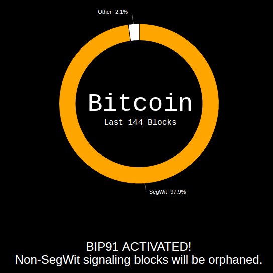 В сети биткоина состоялась активация предложения по масштабированию BIP 91Опубликовано: 8 лет назад Утром в воскресенье, 23 июля, состоялась активация предложения по улучшению биткоина BIP 91, после чего все блоки, не сигнализирующие поддержку Segregated Witness (SegWit), будут отвергаться. По данным xbt.eu, в поддержку SegWit сигнализируют 97.9% майнеров. Напомним, BIP 91 представляет собой модифицированную версию плана BTC1 (SegWit2x), который поддержал целый ряд биткоин-компаний и майнинговых пулов, в мае этого года подписавшихся под соответствующим соглашением в Нью-Йорке. Кроме того, BIP 91 совместим с BIP 148 (UASF) — еще одним предложением по активации оригинального предложения SegWit, описанным в свое время в BIP 141. Таким образом, активация BIP 91 также означает высокую вероятность активации протокола BTC1 (SegWit2x) и фактическое устранения риска хардфорка биткоина вследствие активации BIP 148, которая должна произойти 1 августа. В то же время по-прежнему сохраняется вероятность хардфорка в результате увеличения размера блока до 2 Мб, предусмотренного SegWit2x в течение трех месяцев после активации SegWit. BIP 91 был активирован на блоке 477120. Следующее обновление уровня сложности должно состояться на блоке 477792, следовательно, если не произойдет ничего непредвиденного, фиксация SegWit должна состояться на 479808 (середина августа), а непосредственная активация протокола – на блоке 481824 (конец августа). Напомним, фиксация BIP 91 состоялась в ночь на пятницу, 21 июля, когда более 90% хешрейта сети сигнализировало в поддержку этого решения.