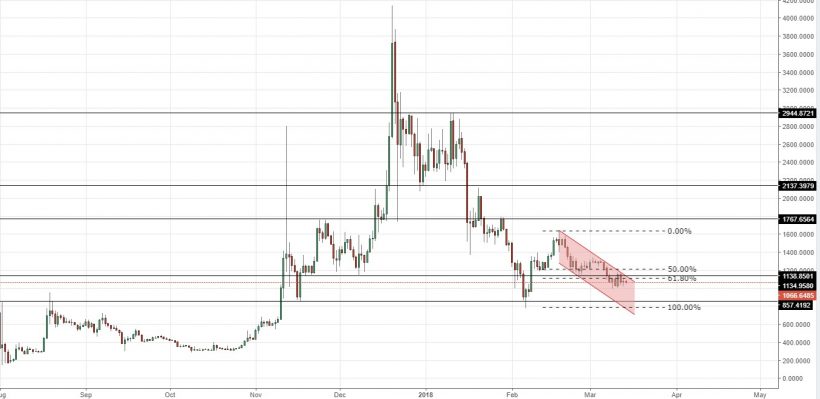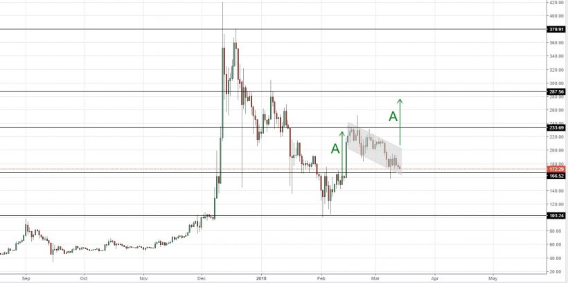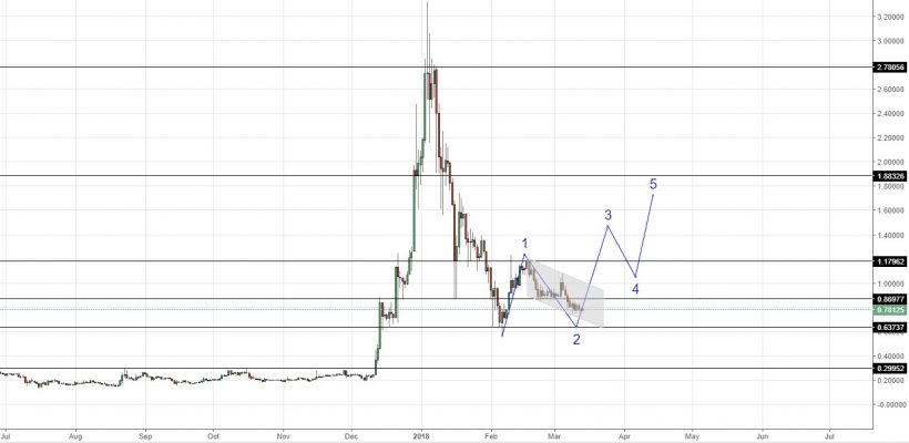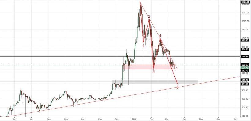 Анализ цен альткоинов: торжество медведейОпубликовано: 7 лет назад С момента публикации предыдущего обзора капитализация криптовалютного рынка снизилась на 16,5% (более чем на $72 млрд). При этом цена биткоина за семь дней опустилась на 15,83%. В то же время индекс доминирования первой криптовалюты снизился несущественно, всего на 0,12% (с 41,60% до 41,48%). Как и прежде, 60% доли рынка капитализации рынка занимают две криптовалюты: Ethereum и биткоин. О возможных сценариях движения цен нескольких популярных альткоинов расскажет аналитик TSI Analytics Егор Тишин. Несмотря на некоторое снижение капитализации криптовалютного рынка, есть ряд положительных новостей сигнализирующих об активизации распространения криптовалют в мире: компания Coinbase сообщила, что ее услугами пользуются порядка 20 миллионов пользователей в 35 странах мира; также Coinbase порадовала новостью о получении лицензии на операции с электронными деньгами (E-money), позволяющую осуществлять деятельность в 23 странах ЕС; в Японии третий по величине поставщик электроэнергии Chubu Electric Power Co анонсировал тестирование биткоин-платежей в сети Lightning; количество нод Lightning Network превысило 1000.ETH/USD Как отмечалось в предыдущем обзоре, в случае пробития ценой наклонного уровня сопротивления, нисходящее движение продолжится и достигнет диапазона $690 — $640. В настоящее время для начала нового восходящего движения цене нужно закрепится выше психологической отметки в $700 и наклонного уровня сопротивления. Если же сопротивление окажется достаточно прочным, цена продолжит нисходящее движение. Первым на его пути станет уровень поддержки $642.79. В случае пробития последнего и закрепления цены ниже его, ожидаем продолжение нисходящего тренда с целями $518.85 — 471.94. Также отметим, отметка 471.94 совпадает с важным наклонным уровнем поддержки, от которого можно ожидать возобновления восходящего движения. В контексте волнового анализа текущее движение можно рассматривать как начало пятой волны, цель которой совпадает с указанным выше ценовым интервалом ($471.94 — 518.85). XRP/USD Ценовому графику инструмента XRP/USD не удалось «запрыгнуть» в третью волну Эллиотта. Вместо этого произошло пробитие и закрепление под уровнем поддержки $0.87, после чего цена продолжила свое нисходящее движение. В данный момент это движение происходит в наклонном канале. Исходя из этого, можно вскоре ожидать незначительного роста к верхней его границе. После этого цена продолжит движение к уровню $0.64, где и может начаться переход в третью волну Эллиота. Если же цена закрепится ниже указанного уровня и отмеченного на графике начала первой волны, суждения о новой пятиволновой формации можно будет отпустить в прошлое и ожидать продолжения нисходящего движения. Целями последнего в таком случае станет психологический уровень $0.50, а затем и уровень поддержки в районе $0.30. В настоящее время предпосылками к формированию восходящего тренда могут послужить: пробитие и закрепление выше $0.87; выход из нисходящего наклонного канала (пробитие верхней его границы).Первым барьером на пути такого движения станет уровень $1.18, пробитие и закрепление над которым повлечет за собой дальнейший рост цены XRP. Глобальная цель для возможной пятиволновой формации находится в ценовом диапазоне $1.70 — $1.88. BCH/USD Цена криптовалюты Bitcoin Cash пробила горизонтальный уровень сопротивления $1138.