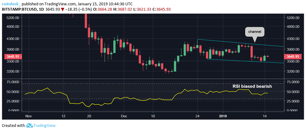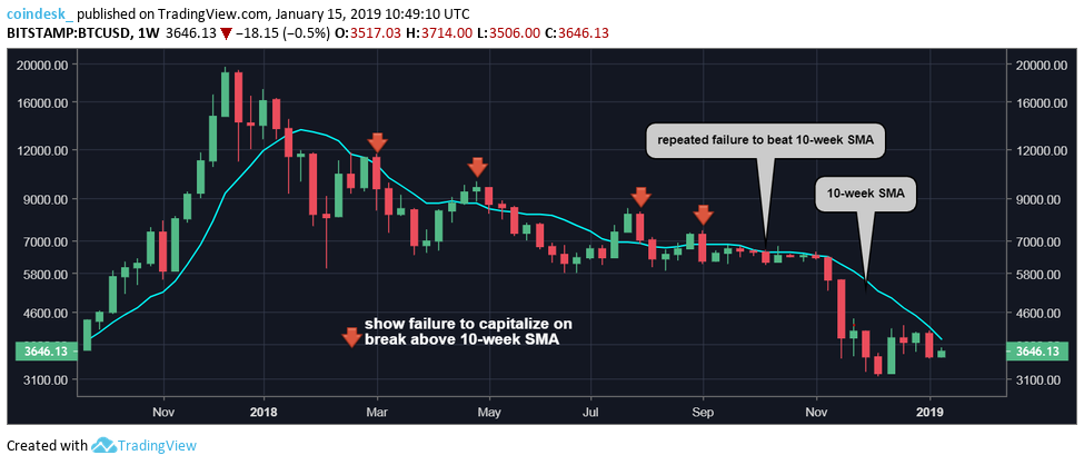Мнение: для смены тренда биткоину нужно преодолеть отметку $3920, а затем и $5400Опубликовано: 7 лет назад По мнению аналитика CoinDesk Омкара Годбоула, чтобы преломить тянущийся больше года медвежий тренд биткоину следует для начала прочно закрепиться выше отметки $3919. Через эту отметку проходит 10-недельная простая скользящая средняя (SMA), которая с начала прошлого года служит серьезным сопротивлением, сдерживающим рост цены первой криптовалюты. Однако эта SMA — лишь первый шаг. Подтверждением смены долгосрочного тренда послужит 21-месячная EMA, проходящая в настоящий момент через отметку $5400. Недельный графикНа графике видно, что цена биткоина в течение большей части года активно противостояла злосчастной SMA 10, пока 14 ноября не провалилась ниже психологического уровня $6000. В 2018 году цена пересекала SMA 10 всего четыре раза — в феврале, апреле, второй половине июля и в конце августа. Каждый раз это мимолетное восходящее движение вводило в заблуждение быков, отчаянно надеявшихся на возобновление ралли. В настоящее время биткоин торгуется в районе $3650 (биржа Bitstamp), находясь ниже 10-недельной SMA. Следовательно, настрой на рынке в целом остается медвежьим. Дневной графикBTC поднялся выше отметки $3556 (минимум 27 декабря), однако цена по-прежнему в рамках нисходящего канала. Индикатор RSI сигнализирует о вероятности того, что вскоре будет пробита нижняя граница этого канала. Затем биткоин, скорее всего, закрепится у декабрьских минимумов вблизи отметки $3122. Часовой графикНа младшем таймфрейме отчетливо просматривается «Нисходящий треугольник», подтверждающий тезис о высокой вероятности краткосрочного снижения цены.