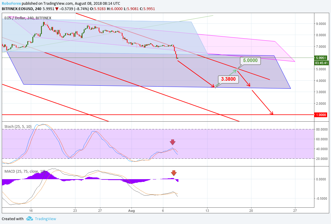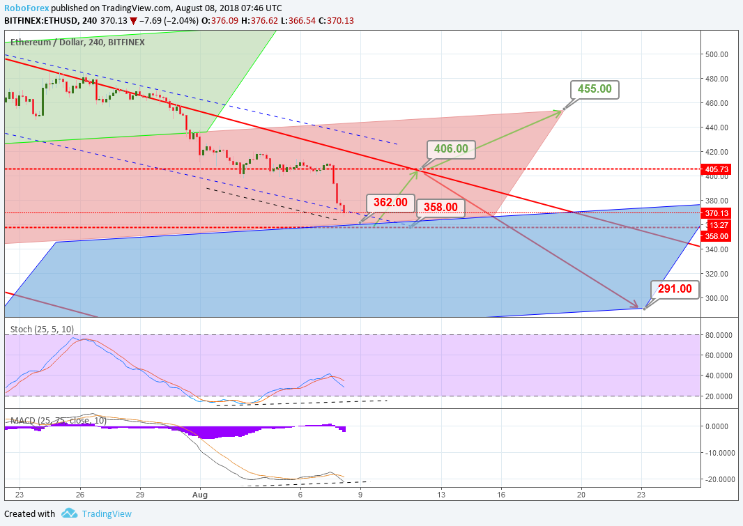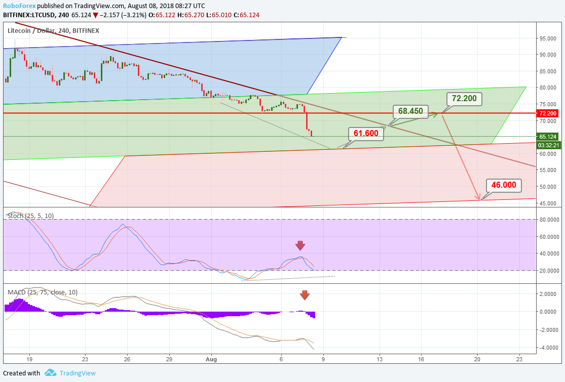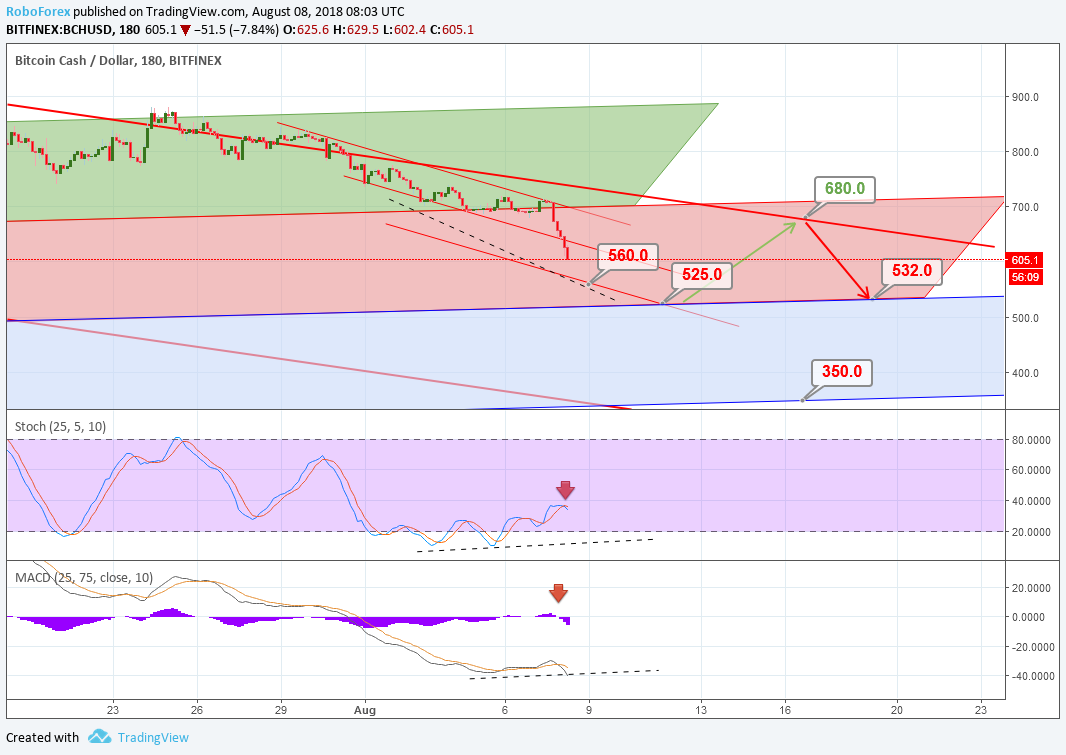 Анализ цен альткоинов: крутое пикеОпубликовано: 7 лет назад Если на прошлой неделе котировки основных инструментов крипторынка пребывали в рамках коррекционных коридоров, то текущая неделя демонстрирует довольно стремительное, хотя и локальное «пике». О дальнейших возможных сценариях движения цен нескольких популярных альткоинов расскажет ведущий аналитик RoboForex Дмитрий Гурковский. Вновь приходится констатировать факт продолжения развития долгосрочной нисходящей тенденции. Но чем дольше и стремительней снижение, тем раньше и ближе рынок окажется у интересных для быков уровней. Однако в ближайшее время рынком продолжат править медведи. EthereumEthereum на четырехчасовом графике демонстрирует продолжение развития нисходящей тенденции в рамках прежнего среднесрочного коридора. Рынок успешно протестировал и преодолел последний значимый фрактальный диапазон между отметками $405 и $406. В настоящий момент котировки Ethereum успешно приближаются к целевому уровню поддержки $362. Cтоит также отметить, что целью ближайшего снижения может являться и фрактал на $358. Рассматривая графики индикаторов MACD и Stochastic, отметим формирование конвергенций, что может быть сигналом к откату после достижения целей текущего нисходящего тренда. В качестве цели отката может выступить линия сопротивления основного канала нисходящего тренда — отметка $406. После отбоя от сопротивления высока вероятность развития нового импульса нисходящей динамики. Bitcoin CashРассматривая динамику котировок Bitcoin Cash на двухчасовом таймфрейме, отметим, что рынку удалось достичь локальных целей снижения. Кроме этого, рынок протестировал и пробил линию поддержки предыдущего коррекционного коридора, что было подтверждено «Черными крестами» на MACD и Stochastic. В настоящее время котировки движутся по направлению к линии поддержки нижнего проекционного канала. Основной локальной целью нисходящего тренда стоит рассматривать отметку $525. Промежуточной целью снижения может стать уровень $560, находящийся на линии поддержки краткосрочного нисходящего канала. Учитывая формирование конвергенции на графиках индикаторов, можно допустить, что достигнув уровней поддержки, котировки совершат откат к линии сопротивления долгосрочного тренда — уровню $680. После этого наиболее вероятным будет развитие нового импульса спада к зоне поддержки у отметки $532. EOSВ данное время динамику котировок EOS необходимо рассматривать с нескольких ракурсов. На четырехчасовом таймфрейме видим, что котировки преодолели линию поддержки краткосрочного канала и пытаются пробить поддержку среднесрочного коррекционного. Сильный импульс снижения был поддержан формированием «Черных крестов» на MACD и Stochastic. Выход и закрепление котировок в нижний проекционный канал позволит рынку нацелиться на область поддержки вблизи уровня $3,38. Учитывая факт перманентного движения вблизи линии сопротивления долгосрочного нисходящего тренда, можно допустить возможность отката к уровню $5, но только после тестирования целевой области поддержки. А после завершения отката и тестирования сопротивления следующей значимой целью в развитии нисходящей тенденции может стать уровень паритета $1, но это перспектива на ближайшие один-два месяца. LitecoinТехническая картина Litecoin демонстрирует движение котировок вблизи линии сопротивления 