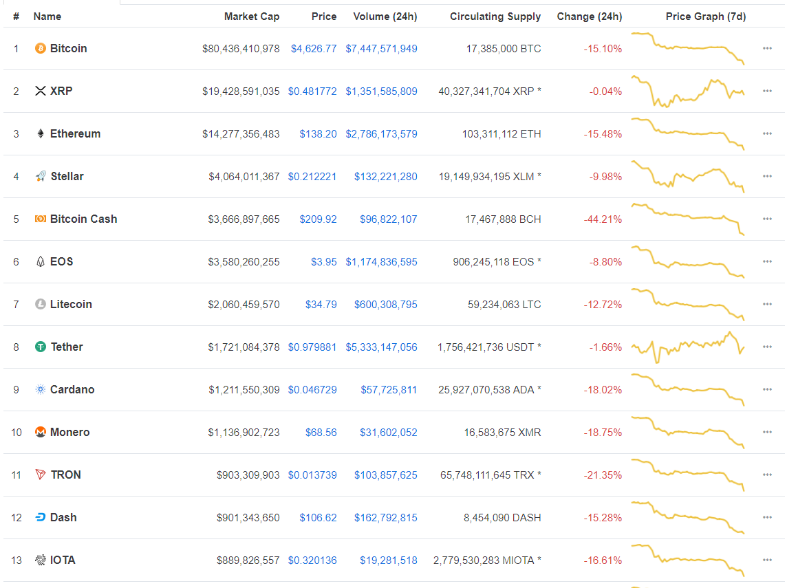 Капитализация криптовалют упала вплотную до $150 млрд, биткоин торгуется около $4500Опубликовано: 7 лет назад В ночь на вторник, 20 ноября, рынок криптовалют продолжил начатое в понедельник резкое падение, и к 07:00 UTC совокупная капитализация рынка опустилась вплотную до отметки $150 млрд. Одновременно с этим средневзвешенный курс биткоина упал на ряде бирж ниже $4500. Последний раз общая капитализация рынка криптовалют находилась ниже $150 млрд в начале октября 2017 года. За последние 24 часа цена биткоина упала более чем на 15%, капитализация первой криптовалюты находится в районе $80 млрд. При этом на биржах по-прежнему наблюдаются ценовые расхождения: если на Bitfinex биткоин на момент публикации торговался в районе $4650, то на Coinbase и Bitstamp – курс опустился ниже $4500 ($4485 на Bitstamp). В то время как остальные криптовалюты также находятся в глубокой красной зоне, обращает внимание резкое снижение средневзвешенного курса Bitcoin Cash – по данным CoinMarketCap, за последние сутки его цена опустилась на 45% до $210. В результате Bitcoin Cash опустился на пятое место по капитализации, пропустив вперед Stellar. Также отметим, что поднявшийся на второе место Ripple (XRP) уже более чем на $5,5 млрд увеличил отрыв от Ethereum (ETH) по капитализации. При этом на фоне остальных активов XRP демонстрирует наиболее стабильную динамику, практически не пострадав в результате событий понедельника и начала вторника. Цена ETH тем временем опустилась до $137, потеряв за последние 24 часа более 16%. Наибольшие потери среди монет первой десятки также понесли Monero (-20%), Cardano (-19%) и Litecoin (-13%) Напомним, ранее основатель и управляющий партнер венчурной фирмы Morgan Creek Энтони Помплиано заявил, что нынешний медвежий рынок можно рассматривать как естественный процесс очищения индустрии от «туристов». Последние новости рынка криптовалют |