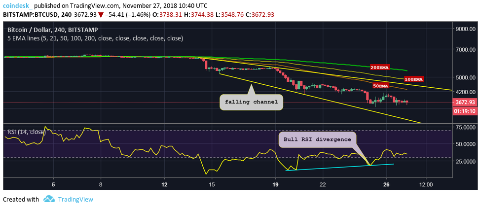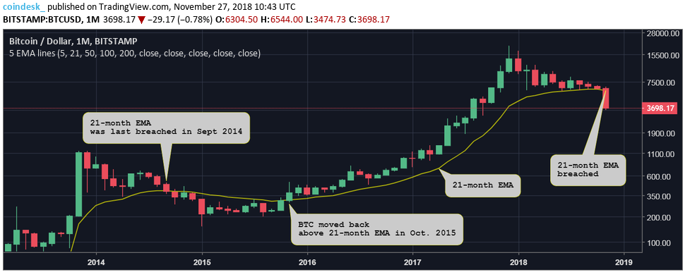 Цена биткоина: следующий ключевой уровень поддержки на отметке $3000Опубликовано: 7 лет назад Впервые с октября 2015 года цена биткоина оказалась ниже ключевой линии поддержки, а следующим значимым уровнем может стать отметка $3000. На это обращает внимание аналитик CoinDesk Омкар Годбоул. На месячном графике можно увидеть, что экспоненциальная скользящая средняя (EMA 21), долго выступавшая нижним пределом цены, была уверенно пробита 15 ноября. В последний раз такое пересечение происходило еще в сентябре 2014 года. После этого цена находилась ниже EMA 21 на протяжении 13 месяцев, до октября 2015 года. В настоящее время уже ставшая уровнем сопротивления EMA 21 проходит через отметку $5896. При этом цена биткоина торгуется в районе $3700 на бирже Bitstamp. Падение ниже EMA 21 знаменует собой продолжение затяжной распродажи, которая длится со второй половины декабря прошлого года, когда BTC вплотную приблизился к отметке $20 000. Это означает, что путь наименьшего сопротивления направлен «на юг». В краткосрочной перспективе вероятен выход цены из зоны глубокой перепроданности. Однако шансы на то, что биткоин вернется к уровню на EMA 21 в настоящее время крайне низки. Вряд ли возникнут сомнения в том, что месячная свеча закроется ниже этого ключевого уровня поддержки. Четырехчасовой графикНа ближайшие 24 часа техническая картина в паре BTC/USD остается медвежьей. Цена биткоина находится в ловушке нисходящего канала. «Тяжелые» EMA с периодами 50, 100 и 200 расположены последовательно, одна над другой, и направлены вниз. Это также говорит о преобладании продавцов на рынке. В то же время индекс относительной силы (RSI) демонстрирует бычью дивергенцию. Однако модель заслуживает доверие лишь в том случае, если цена биткоина преодолеет уровень сопротивления на отметке $4000. Если же биткоин пробьет вниз соответствующую минимуму 2018 года отметку $3473, то недавнее восстановление до отметки $4000 можно будет расценивать как dead cat bounce («прыжок дохлой кошки» — означает временное восстановление цены после затяжного падения без последующей смены тенденции). После этого цена BTC с большой вероятностью устремится к следующему уровню психологической поддержки на отметке $3000. С другой стороны, если сработает бычья дивергенция RSI на фоне пробития отметки $4000, то цена сможет протестировать уровень $4500. Напомним, ранее глава Genesis Trading Майкл Моро выразил мнение, что падение цены биткоина остановится на отметке $3000. Последние новости рынка криптовалют |