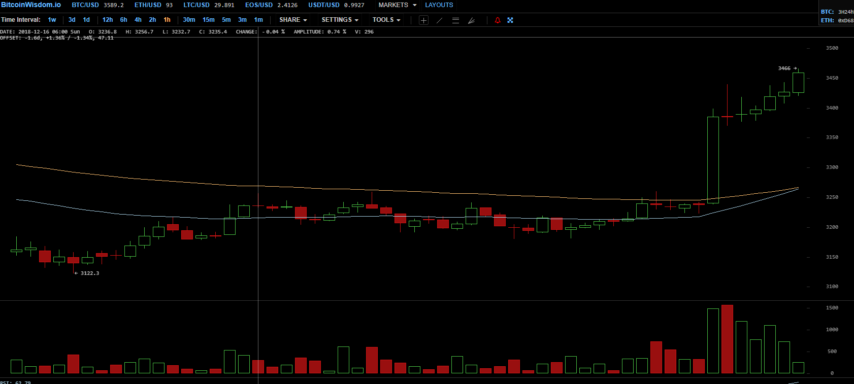 Дно позади или прыжок дохлой кошки? Цена биткоина выросла на 6% за несколько часовОпубликовано: 7 лет назад Сегодня, 17 декабря, цена первой криптовалюты внезапно вырвалась из флэта, за несколько часов пройдя путь примерно в $200. На получасовом графике биржи Bitstamp можно увидеть, что рост сопровождается значительным повышением объемов торгов. На момент написания материала биткоин приближается к отметке $3500. Как отмечают аналитики CoinDesk, ценой успешно отработаны два паттерна, знаменующие собой восходящую коррекцию, либо же разворот тренда. Это «Падающий клин» и «Перевернутые голова и плечи»: