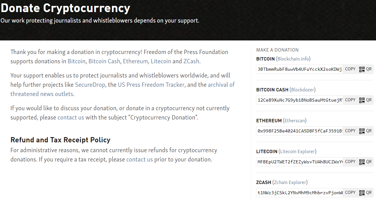 Фонд «Свобода прессы» начал принимать пожертвования в криптовалютеОпубликовано: 7 лет назад Некоммерческая организация «Свобода прессы» (Freedom of the Press Foundation, FPF) отныне принимает пожертвования в нескольких популярных криптовалютах, включая биткоин, Bcash, Ethereum, Litecoin и Zcash.
