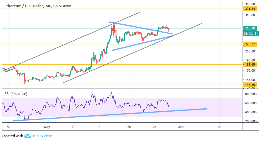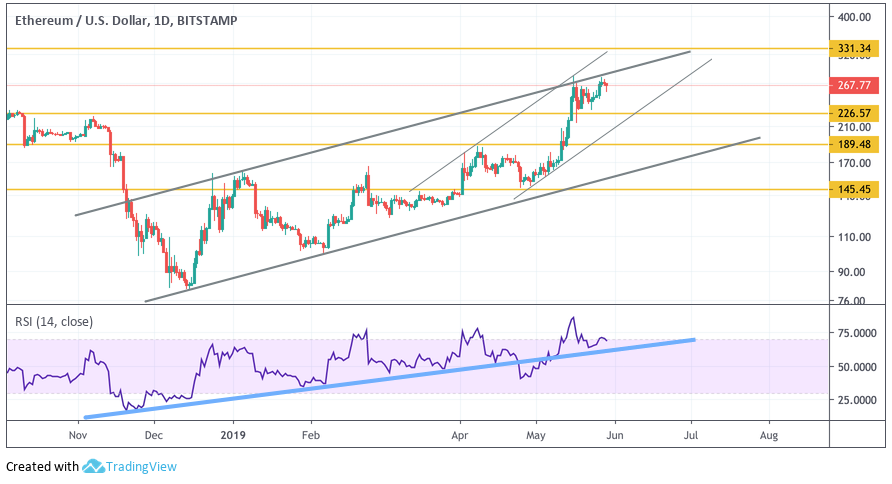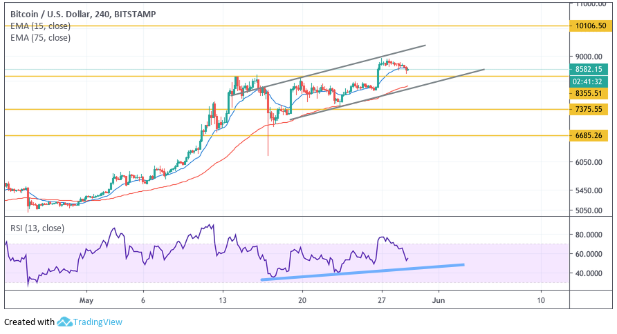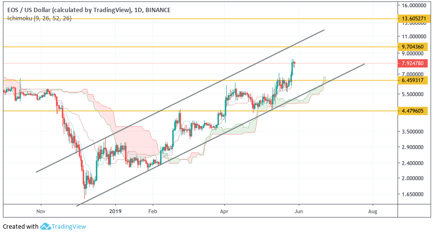 Анализ цен криптовалют: все говорит в пользу новой волны ростаОпубликовано: 6 лет назад Биткоин продолжает штурмовать максимумы. На данный момент котировки пробили сопротивление на $8000. Более того: в очередной раз криптовалюта смогла отменить разворотную модель вблизи важного уровня, что указывает на сильный импульс. Не исключено, что в ближайшее время цифровой актив перевалит за $10000. Схожую ситуацию мы можем наблюдать у Litecoin, где не произошло формирования модели ”Двойная вершина” и состоялся пробой максимумов. Такой сценарий также указывает на скорый рост цифрового актива к новым высотам. БиткоинБиткоин продолжает торговаться в рамках восходящего канала. Пробой же верхней границы одного из каналов формирует сильный сигнал к продолжению роста на ширину данного канала. Скользящие средние также указывают на наличие бычьей тенденции. С момента, как быстрая скользящая средняя пересекла медленную снизу вверх, указывая на смену тенденции в пользу восходящей, еще не было ни одного пробоя медленной скользящей. Это только подтверждает желание рынка двигаться дальше вверх. В качестве основной торговой идеи стоит ожидать незначительную коррекцию к верхней границе канала на уровне $8200 и продолжение роста с потенциальной целью на $10000. Дополнительным сигналом в пользу такого движения цены выступит отскок от линии поддержки на индикаторе относительной силы (RSI). Здесь мы также наблюдаем регулярные отскоки от восходящей линии тренда на графике индикатора. Отменой варианта роста может выступить снижения и пробой уровня поддержки с закрытием котировок BTCUSD под $6900. В этом случае стоит ожидать продолжения коррекции с потенциальной целью вблизи области $5800, а далее — к $5000. Анализ 4-часового графика подтверждает идею с ростом курса криптовалюты. Как видим, котировки движутся в рамках восходящего канала. В качестве краткосрочной торговой идеи стоит ожидать коррекцию к нижней границе канала на уровне $8450 с попытками продолжения роста. В пользу такого варианта также выступит отскок от линии поддержки на индикаторе RSI. Пробой верней границы канала и закрытие над уровнем $9200 станет подтверждением роста. Отменой такого варианта может стать пробой нижней границы восходящего канала с закрытием под уровнем $8355, что укажет на продолжение снижения к уровню $7375. EOSEOS движется над верхней границей Облака индикатора Ichimoku Kinko Hyo, что указывает на продолжение бычьей тенденции. Котировки при этом уверенно отталкиваются от уровня сигнальных линий индикатора. В прошлом обзоре говорилось, что для продолжения роста важно увидеть пробой уровня сопротивления и закрытие над $7.10. На данный момент уровень пробит и стоит ожидать продолжения подъема с целью на уровне $9.70. В качестве основной торговой идеи предполагается коррекция актива с тестом сигнальных линий индикатора на уровне $6.50 и продолжением роста. Отменой варианта подъема может выступить пробой уровня поддержки с закрытием под $5.45. При таком сценарии развития стоит ожидать возобновления нисходящей тенденции и продолжения падения. На 1-часовом графике котировки торгуются в рамках восходящего канала. Структура движения цены выглядит симметричной. Котировки отталкиваются от нижней границы канала. Кроме того, мы здесь также наблюдаем наличие восходящей тенденции. В качестве краткосрочной торгов