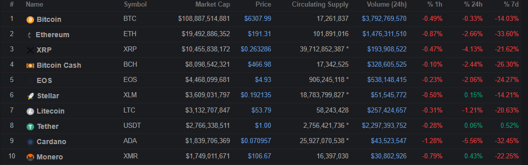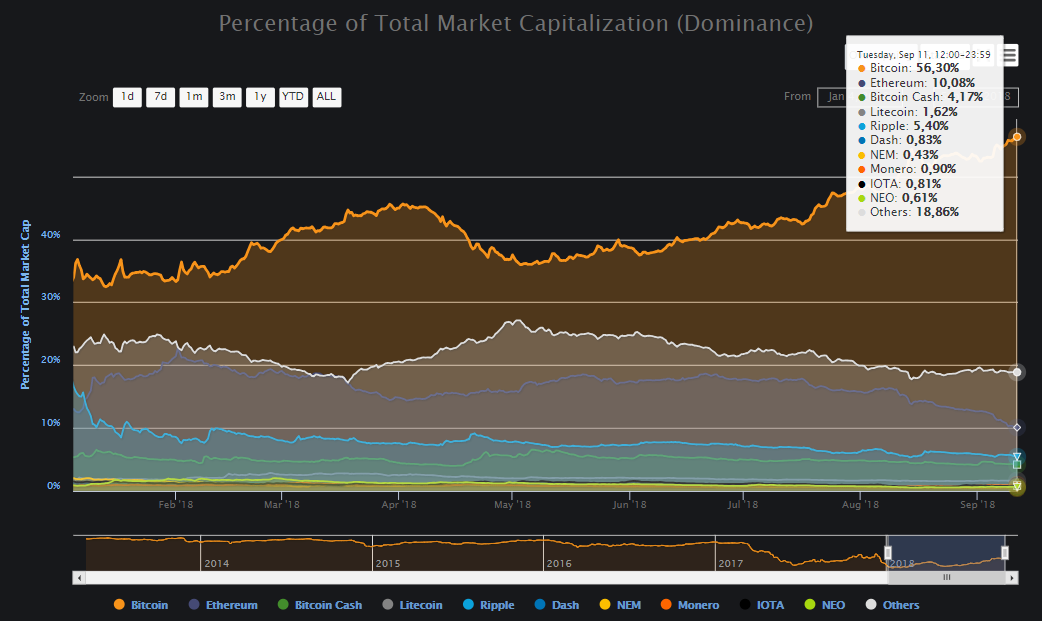 Индекс доминирования биткоина обновил максимум 2018 годаОпубликовано: 7 лет назад На фоне затянувшейся рецессии постепенно растет доля биткоина на рынке криптовалют. По данным CoinMarketCap, в настоящее время индекс доминирования биткоина составляет 56,3%, что является наивысшим значением в текущем году: Другими словами, сейчас биткоин в разы популярнее более молодых, но волатильных и несколько менее ликвидных монет. В частности, капитализация BTC ($108,9 млрд) в 5,6 раз превышает общую рыночную стоимость Ethereum ($19,4) и более чем в 10 раз — Bitcoin Cash ($8 млрд). На графике выше также указано, что доля низколиквидных альткоинов, находящихся в основном за пределами первой двадцатки CoinMarketCap, составляет 18,86%. Из всего этого следует, что по мере спада деловой активности на рынке, криптоинвесторы предпочитают сохранять осторожность, отдавая предпочтение «цифровому золоту» и несколько реже — высоколиквидным альткоинам, часто оставляя «за бортом» менее капитилизированные активы. Также отметим, что первая десятка CoinMarketCap плотно увязла в «красной зоне»: Примечательно, что на фоне затянувшегося медвежьего рынка растет капитализация Tether (USDT), относительно высок и объем торгов этим стейблкоином. Напомним, месяц назад общая капитализация рынка криптовалют упала до ноябрьских значений. Существенного оживления с тех пор не происходило и сейчас общая стоимость представленных на рынке криптовалют составляет $193,6 млрд. Последние новости рынка криптовалют |