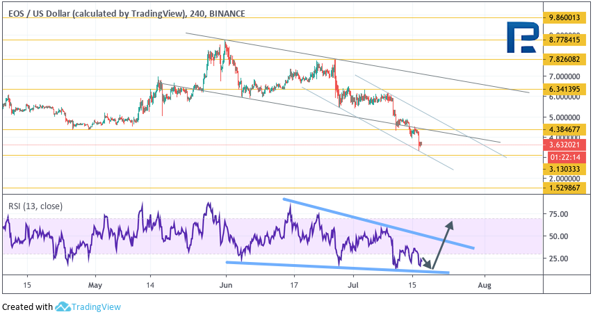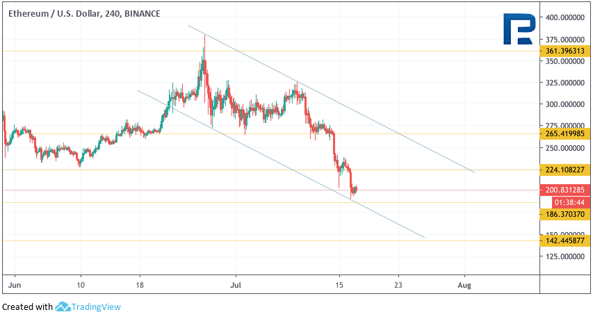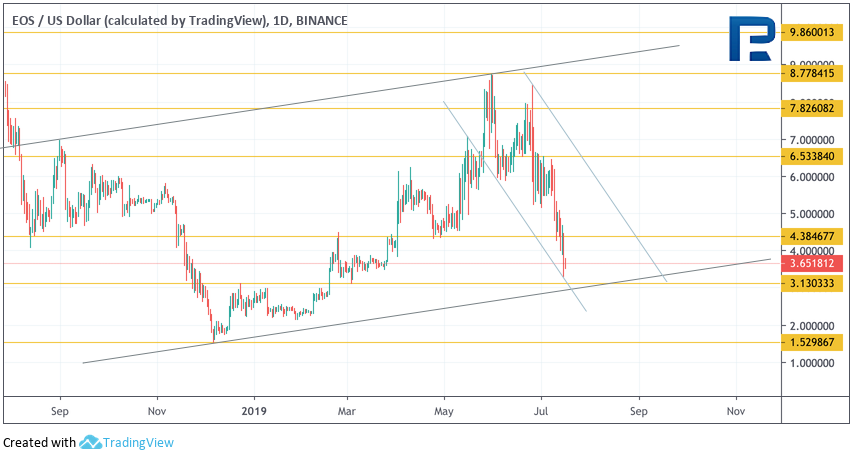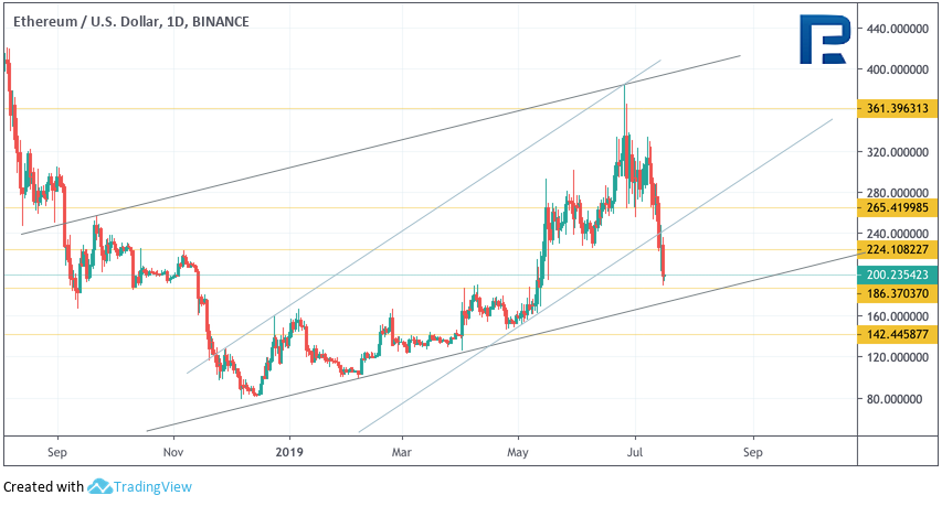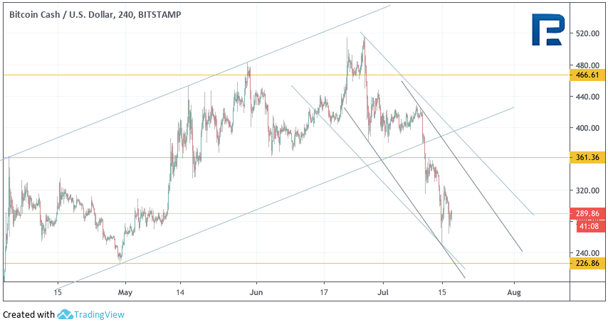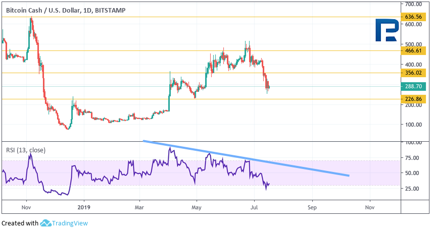 Bitcoin Cash Дневной график криптовалюты Bitcoin Cash демонстрирует сильное снижение. Значения индикатора RSI здесь тоже протестировали области ниже уровня 30 впервые с конца 2018 года. Такой тест может указывать на вероятный разворот от уровня $225. Первой целью роста выступает уровень $355. Дополнительным сигналом в пользу подъема станет пробой нисходящей линии тренда на индикаторе RSI. Отменой такого варианта выступит пробой области $225, в случае чего целью падения выступит уровень $150.