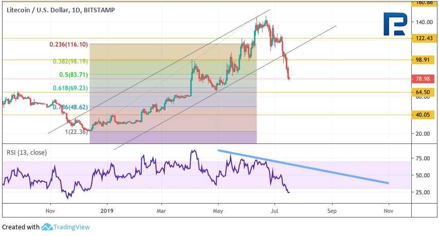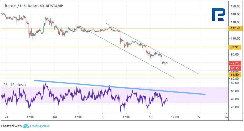 На 4-часовом котировки Ethereum тестируют нижнюю границу нисходящего канала. Текущая структура движения цены предполагает отскок и тест уровня $265, где ожидается разворот и продолжение падения с целью на уровне $185. В случае сильного роста и пробоя верхней границы нисходящего канала с закреплением над уровнем $280 стоит ожидать возобновления роста. Если же продавцы продолжат давление и смогу закрепиться ниже уровня $180 уже с текущих уровней, это станет сильным сигналом к продолжению падения без восходящей коррекции. Litecoin В целом Litecoin движется в рамках ожиданий. Продавцы демонстрируют свою силу. Однако важная область поддержки находится на уровне $65,00. Там же располагается и уровень коррекции 0.618%. по Фибоначчи В качестве основной торговой идеи стоит ожидать продолжение падения с целью на $64,50, где покупателям, скорее всего, удастся развернуть цену вверх. Целью для такого отскока выступит уровень $100,00, а подтверждением станет пробой нисходящей линии тренда на индикаторе RSI. Значения индикатора упали ниже уровня 30 впервые с декабря 2018 года, что тоже указывает на потенциальный отскок вверх. Отменой варианта с ростом актива станет пробой уровня поддержки и закрепление под $60,00, что говорит о продолжении развития нисходящего импульса к цели на $40,00. На 1-часовом графике Litecoin продолжает падение в рамках канала. В качестве краткосрочной торговой идеи стоит ожидать теста верхней границы нисходящего канала на уровне $80,00 и продолжения падения к уровню $64,50. Дополнительным сигналом в пользу развития такого варианта выступает отскок от нисходящей линии тренда на индикаторе RSI. Подтверждением разворота послужит пробой верхней границы нисходящего канала после теста уровня поддержки на $64,50.