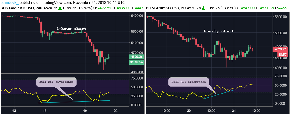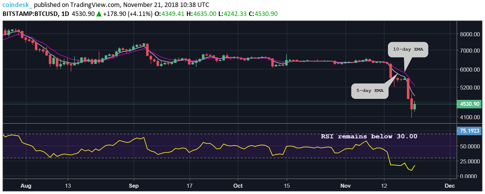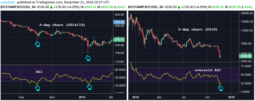 Мнение: цена биткоина уже оттолкнулась от днаОпубликовано: 7 лет назад О выходе из глубокой перепроданности свидетельствует индекс относительной силы (RSI). В последний раз столь низкие его значения на трехдневном графике были в январе 2015 года. Однако значения RSI постепенно растут и, скорее всего, вскоре преодолеют отметку 30.00. Следовательно, ретест отметки $4048 в ближайшем будущем маловероятен. При этом не исключено, что постепенно наберет обороты восходящее коррекционное движение. Трехдневный графикНа графике слева можно увидеть что в январе 2015 года цена достигла дна на фоне выхода RSI из перепроданности. После этого началось уверенное восстановление биткоина и уже к середине месяца цена достигла отметки $300. В настоящее время ситуация во многом схожа — RSI также находится на отметках ниже 30.00. Таким образом, с выходом индекса относительной силы из зоны перепроданности возможен прорыв выше психологического уровня $5000. Четырехчасовой и дневной графикиБычьи дивергенции RSI на младших таймфреймах свидетельствуют о том, что медведи выдохлись вблизи отметки $4000, а также о высокой вероятности уверенного восстановления цены. Дневной графикНа дневном графике видно, что экспоненциальные скользящие средние (EMA) с периодами 5 и 10 обращены вниз. Это обстоятельство может несколько сдерживать восходящее коррекционное движение. С другой стороны, если коррекционное ралли усилится и позади окажется отметка $5242, через которую проходит EMA 10, то можно будет говорить о кардинальной смене настроений на рынке. Однако обвал продолжится, если цена BTC закроется ниже 200-недельной EMA на отметке $4182. Тогда следующей поддержкой станет уровень $4000. Напомним, на прошлой неделе Омкар Годбоул верно подметил, что поддержка на $5000 может не устоять, а вероятность роста цены BTC крайне низка. Последние новости рынка криптовалют |