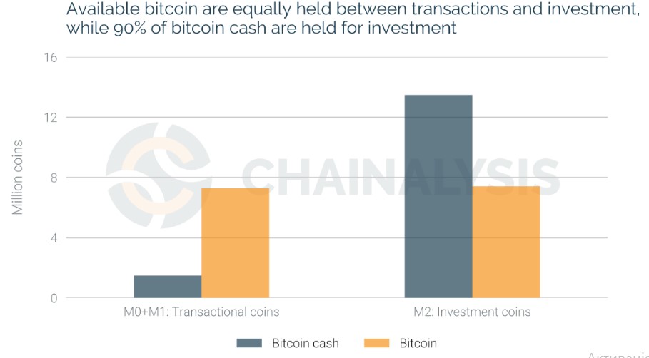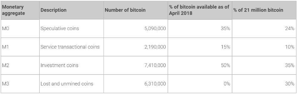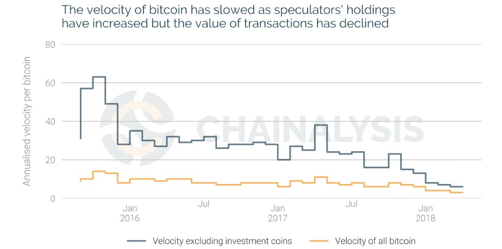 Денежную массу разделяют на денежные агрегаты от М0 (наиболее ликвидная категория) до М3 (наименее ликвидная). Сопоставление этих денежных агрегатов с биткоинами представлено в таблице ниже. В будущем может возникнуть дополнительная категория, которая будет включать биткоины, удерживаемые в течение определённого периода времени в качестве финансового инструмента. Пример этой категории — биткоины, отправленные на биржи для трейдинга или хранящиеся в качестве хеджирования до истечения срока действия фьючерсов. Эта категория более ликвидна, чем потерянные или не намайненые монеты и, возможно, чем некоторые инвестиционные монеты. Денежная масса биткоинаПо состоянию на апрель 2018 года из 21 млн. биткоинов (которые когда-либо будут существовать) не намайнено около 4 млн. и потеряно по меньшей мере 2,3 млн. В качестве долгосрочных инвестиций удерживается 7,4 млн. (из которых ещё 1,5 млн. могут быть потеряны). В операционных транзакциях (например, на биржах) используется 2,2 млн. Спекулянтами удерживается 5,1 млн. С сентября 2015 года большинство биткоинов удерживалось для инвестиций. Тем не менее в прошлом году эта тенденция пошла на снижение — с 72% доступных биткоинов в апреле 2017 года до 50% в апреле 2018 года. В то же время было увеличено количество спекулятивных биткоинов с 14% в апреле 2017 года до 35% в апреле 2018 года. Это говорит о том, что инвесторы обналичили некоторые из своих активов. Эти биткоины теперь находятся в руках новых пользователей, которые используют их для спекулирования или совершения транзакций вместо того, чтобы удерживать в качестве долгосрочных инвестиций. Не все эти инвестиционные кошельки активны. Неактивным исследователи считают инвестиционный кошелёк, который с 2016 года не потратил ни одного биткоина. Эти неактивные кошельки содержат 1,5 млн. монет, которые в основном распределены крупными суммами от 100 до 10 000 штук. Скорость обращения биткоинаPQ = MV — популярная, хотя и несовершенная концептуальная основа для оценки криптовалют. P — цена биткоина в долларах США, Q — количество монет в транзакционном обороте, поэтому P, умноженное на Q, отражает годовую стоимость транзакций биткоина в долларах США. M — денежная масса, долларовая стоимость биткоина, доступная для транзакций, а V — скорость, среднее количество потраченных монет в течение года. Если в денежную массу M включать инвестиционные, транзакционные и спекулятивные монеты, скорость (V) составляет 8,7 в 2016 году и со временем остаётся довольно стабильной (оранжевая линия в приведённой ниже таблице). Однако, если инвестиционные монеты исключить (что логично, так как они практически не используются для транзакций), то скорость обращения биткоина в среднем составит 26,4 в течение 2016 и 2017 годов (синяя линия). Кроме того, скорость обращения биткоина по обеим определениям денежной массы замедляется с января 2018 года. Средняя скорость с января по апрель 2018 года снизилась до 8,5 на основе только транзакционных и спекулятивных монет и до 4,4 для денежной массы всех доступных биткоинов. Это снижение скорости в 2018 году связано с увеличением краткосрочных спекуляций и снижением объёмов транзакций, поэтому либо экономическая активность для биткоина поднимется (появятся новые варианты использования или новые пользователи), либо эти новые спекулянты непреднамеренно станут ходлерами. Дене