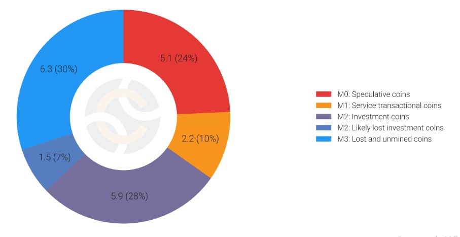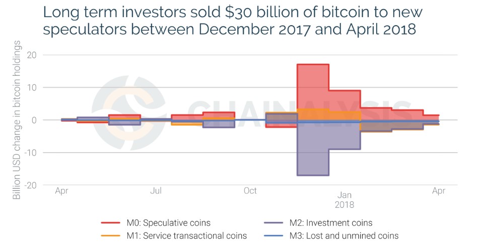 Chainalysis: C декабря 2017 по апрель 2018 года продано биткоинов на $30 млрд.Опубликовано: 7 лет назад Аналитическая компания Chainalysis провела анализ, в котором применила концепцию денежной массы к биткоину. В анализе все монеты были разделены на принадлежащие инвесторам, спекулянтам (под которыми следует понимать лиц, торгующих деривативами или валютами с высоким риском в обмен на более высокую по сравнению со средней потенциальной прибылью) и сервисам (связанным с биткоин-транзакциями). Также были выделены потерянные биткоины. Долгосрочные инвесторы продали биткоинов на $30 млрд. спекулянтам в период с декабря 2017 по апрель 2018 года, причём половина этой суммы была реализована в декабре. Исследователи утверждают, что это была беспрецедентная распродажа и вряд ли она скоро повторится. Кластеры, выделенные Chainalysis на основе анализа данных блокчейна, разделены на типы пользователей монет. Это позволяет определить денежную массу по денежным агрегатам, то есть разделить монеты на: