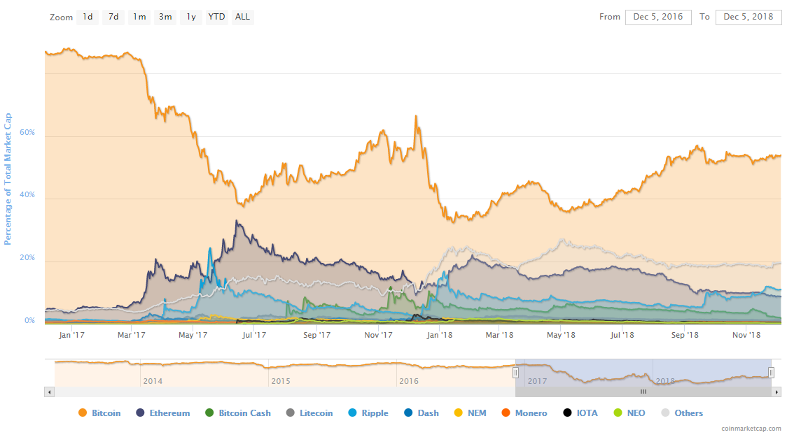 Отметим, что в настоящий момент индекс доминирования биткоина, по данным CoinMarketCap, составляет 54%, хотя еще в январе 2017 этот показатель составлял около 88%. Однако уже в январе 2018 года доля биткоина на рынке составляла менее 33%, после чего снова пошла вверх. Несколько ранее, в июле 2017 года, возникла ситуация, когда биткоин по этому показателю, как тогда казалось, был готов обойти Ethereum, однако так называемый flippening так и не случился. Совокупная капитализация рынка криптовалют на сегодняшний день составляет около $125 млрд, из них на биткоин приходится $67,5 млрд. Последние новости рынка криптовалют |