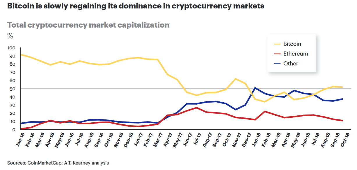 В 2019 году биткоину предсказывают рост доминирования над альткоинамиОпубликовано: 7 лет назад Ведущая консалтинговая фирма A.T. Kearney предполагает, что к концу 2019 года биткоин вернет себе прежнее доминирование с точки зрения рыночной капитализации, чему, среди прочего, будет способствовать нестабильность альткоинов. Такой прогноз содержится в последнем аналитическом отчете компании.
