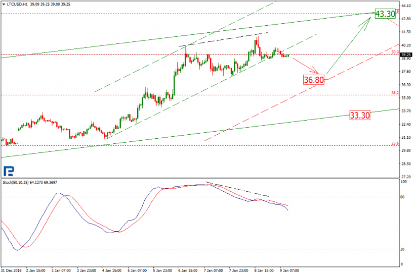 1-часовой таймфрейм Ethereum демонстрирует развитие коррекционного коридора в форме «Флага». На данном участке стоит отметить формирование «Золотого креста» на индикаторе Stochastic и выход из зоны перепроданности. Все эти обстоятельства могут указывать на начало развития волны роста, первичной целью которой будет линия сопротивления текущего «Флага» — отметка $158. Ее пробой позволит котировкам подняться к среднесрочной цели на $168,73. LitecoinРассматривая техническую картину Litecoin на 4-часовом графике, сразу же стоит отметить, что коррекционный тренд роста превысил последний значимый максимум и достиг уровня 50% по шкале Фибоначчи. При этом на индикаторе MACD наблюдается формирование дивергенции, что может означать завершение развития восходящего тренда. Пока не стоит исключать возможность очередного повышения цен к уровню Фибоначчи в 61,8% ($43,30). После такого повышения можно ожидать снижение к линии поддержки на уровне $35,27, а при его пробое откроются перспективы к снижению до отметки $26,65. В настоящий момент поддержка находится около уровня $33,30. На 1-часовом графике Litecoin наблюдаем начало коррекционного периода после дивергенции и «Черного креста» на Stochastic. Котировки пробили линию поддержки предыдущего канала роста. Целью коррекционного снижения будет отметка $36,80. XRP4-часовой график XRP демонстрирует классическую затяжную консолидацию в виде «Треугольника», который ушел ниже линии поддержки канала роста. На индикаторе MACD наблюдается формирование «Золотого креста», который может быть предвестником выхода из консолидации вверх и возврата котировок в рамки канала. Целями же продолжения коррекционного роста могут стать уровни 38,2% ($0,4710) и 50% ($0,5310) по шкале Фибоначчи. Рассматривая 1-часовой график XRP, можно более детально рассмотреть «Треугольник». Актуальная техническая картина позволяет сделать прогноз о том, что пробой верхней границы даст котировкам шанс подняться к уровню $0,4071, а пробой нижней откроет путь к поддержке на $0,3174. При этом наблюдаются предпосылки к формированию «Золотого креста» на Stochastic. Внимание! Прогнозы финансовых рынков являются частным мнением их авторов. Текущий анализ не представляет собой руководство к торговле. RoboForex не несёт ответственности за результаты работы, которые могут возникнуть при использовании торговых рекомендаций из представленных обзоров. Последние новости рынка криптовалют |