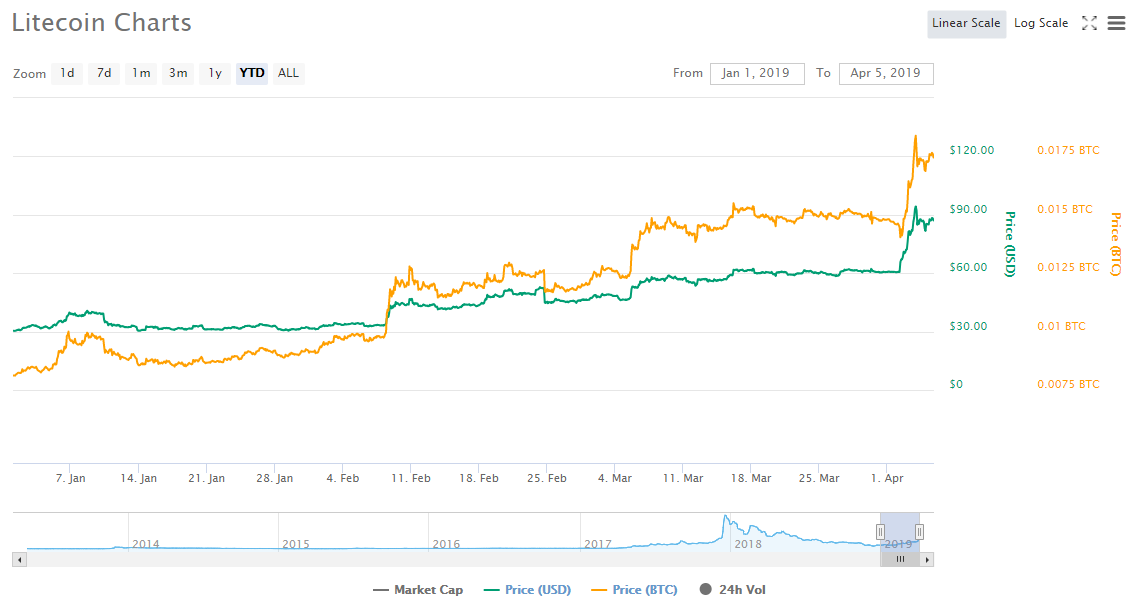 Также он провел аналогии между рыночными капитализациями золота и серебра, обратив внимание, что показатель серебра, который, по его словам, как минимум полезен в промышленных целях, составляет всего 0,17% от золота. В то же время капитализация Litecoin занимает 6,4% от аналогичных показателей с биткоина, однако, как говорит Новограц, причины этого ему совершенно непонятны. Напомним, в первом квартале 2019 года «цифровое серебро», как иногда называют Litecoin, проделав путь от $30 до $61, выросло в цене на 100%. Это стало лучшим показателем за всю историю существования этой криптовалюты. За последние несколько дней LTC продолжил рост, добравшись в определенный момент до $94, сегодня торгуется в районе $87. Несмотря на это, p2p-платформа Hodl Hodl, например, объявила, что отныне позиционирует себя в качестве площадки, работающей исключительно с биткоином (BTC), и отказывается от поддержки Litecoin (LTC). Последние новости рынка криптовалют |
