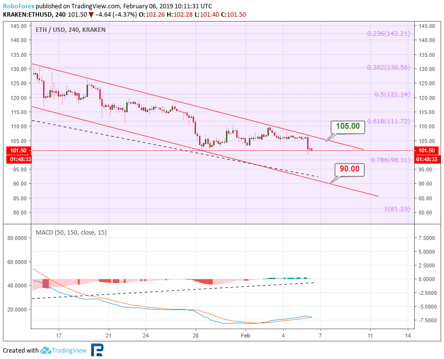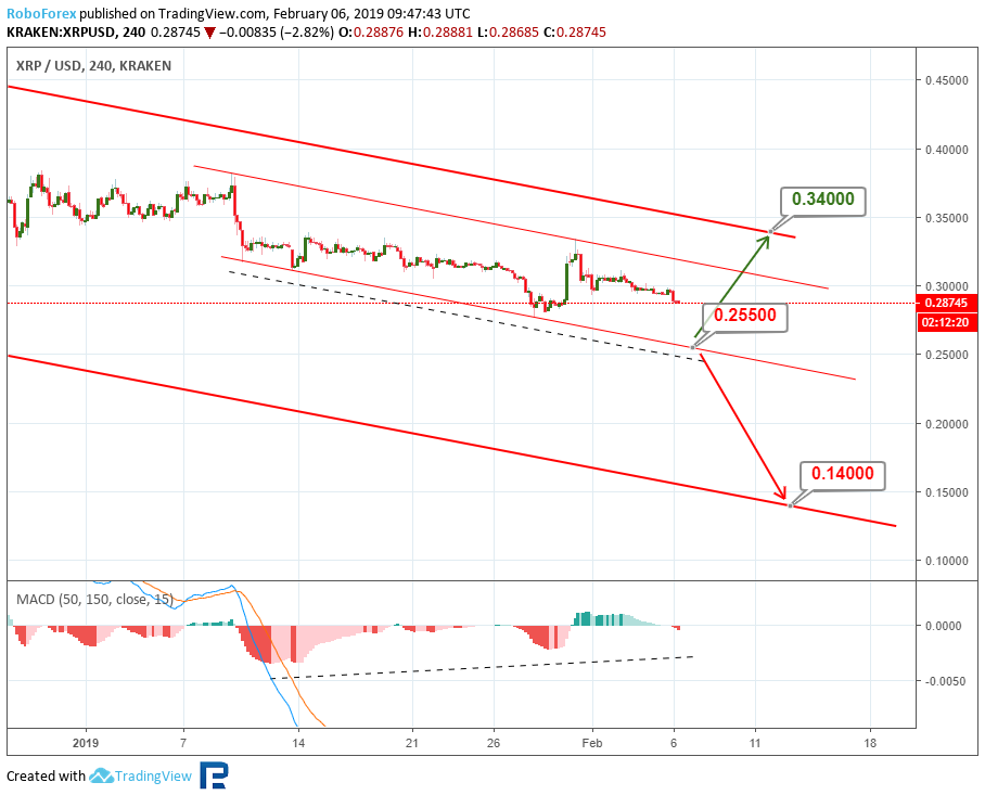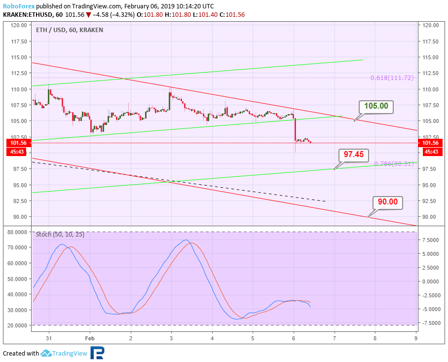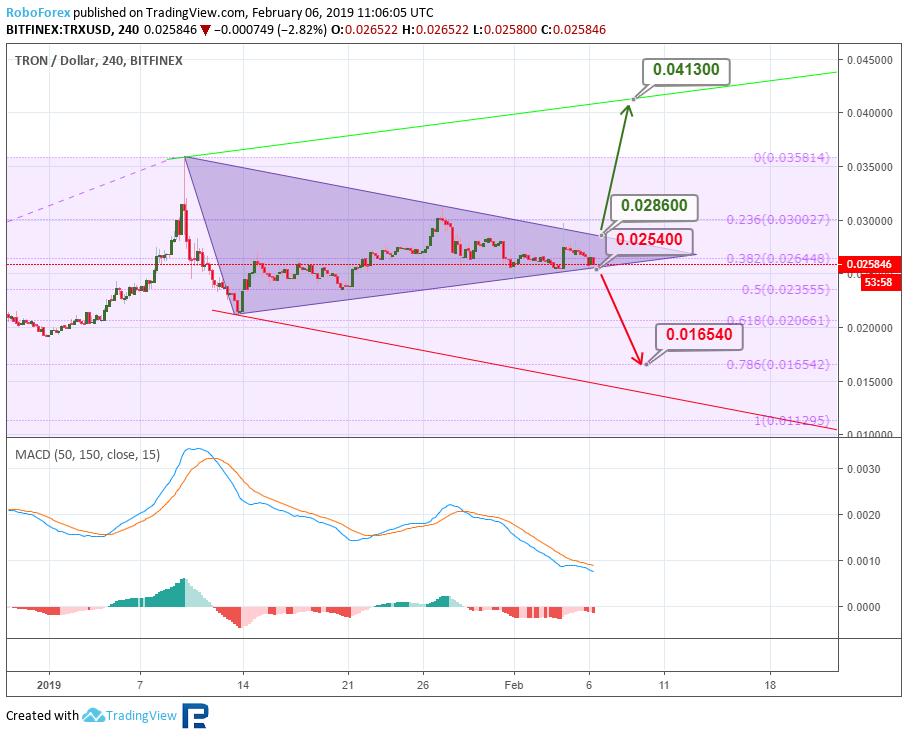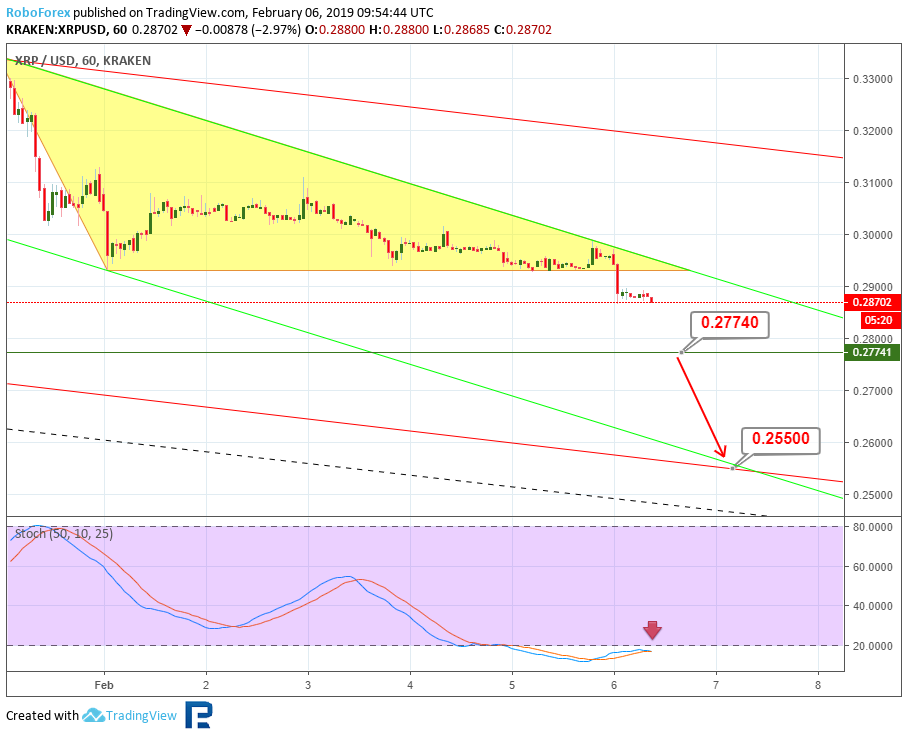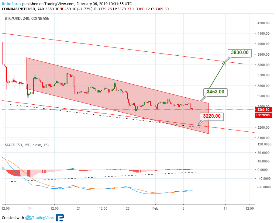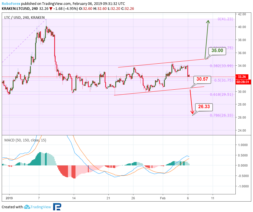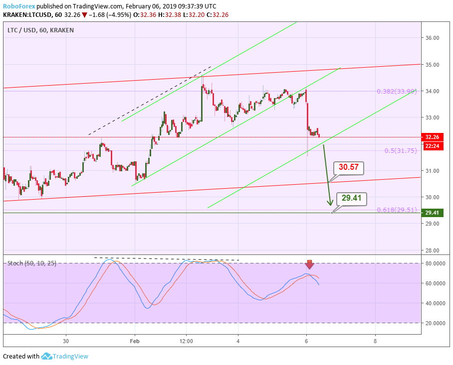 Анализ цен криптовалют – нисходящий тренд продолжаетсяОпубликовано: 7 лет назад О дальнейших возможных сценариях движения цены биткоина и нескольких популярных альткоинов рассказывает ведущий аналитик RoboForex Дмитрий Гурковский. Рынок криптовалют переживает период влияния так называемого «шатдауна» в правительстве США. Исходя из этого, вся динамика выглядит очень вялой, медленной, неуверенной. Нисходящий тренд, наблюдающийся у всех топ-инструментов рынка, по-прежнему пытается дотянуться до последних минимумов. Среди наиболее заметных последних событий можно отметить продажу управляющим Mt. Gox большого объема биткоинов через BitPoint, стремительный рост капитализации Binance Coin после анонса очередного токенсейла на платформе Launchpad, а также фишинговую атаку на кошелек MyEtherWallet. БиткоинНа 4-часовом графике BTC видим, что котировки заканчивают очередной боковик, пытаясь пробить локальные минимумы. Текущий нисходящий канал стремится к линии поддержки долгосрочного канала – к уровню $3220,00. Также стоит отметить, что на индикаторе MACD формируется конвергенция, что может означать приближение отката. Откат может последовать после отскока от линии поддержки и уровня $3220,00. Целью откатного движения будет линия сопротивления краткосрочного нисходящего коридора – уровень $3453,00. Пробив эту отметку, рынок может продолжить рост до линии сопротивления основного канала – к уровню $3830,00. На 1-часовом таймфрейме BTC можем увидеть более подробную картину преодоления линии поддержки и закрепления котировок ниже нее. “Черный крест” индикатора Stochastic может служить подтверждением дальнейшего снижения. Краткосрочной целью спада котировок будет локальный минимум $3337,00. TRXРассматривая 4-часовой таймфрейм TRX, видим, что котировки криптовалюты сформировали треугольник. Такая конструкция говорит о наличии коррекционной фазы в динамике инструмента. Наиболее вероятным движением в ближайшем будущем будет пробой нижней границы поддержки около уровня $0,254 и снижение к уровню 76,0% ($0,0165) по Фибоначчи. Этот вариант поддерживается нисходящей динамикой индикатора MACD. Исключать возможность прорыва зоны сопротивления у отметки $0,0286 не стоит. Прорыв этого уровня может стать сигналов для развития массированной волны роста к уровню сопротивления $0,0413. На 1-часовом таймфрейме TRX видим тестирование линии поддержки треугольника. Линии индикатора Stochastic ушли в зону перепроданности. Такая картина может говорить о возможности отскока и роста к линии сопротивления – к уровню $0,0286. EthereumEthereum на 4-часовом графике ETH по-прежнему демонстрирует стабильную нисходящую тенденцию. После пробоя минимума котировки направлены на достижение уровня 76,0% ($98,30) коррекции по Фибоначчи. Реализация такого плана может оказаться успешной уже в ближайшее время. Не исключено снижение к линии поддержки канала — к отметке $90,00. Но наблюдающаяся конвергенция на MACD, может означать приближение коррекции. Первичная волна отката будет направлена на достижение линии сопротивления и уровня $105,00. 1-часовой таймфрейм ETH показывает пробой локальной линии поддержки предыдущей коррекционной фазы. Импульс спада стремится к проекционной линии поддержки и уровню $97,45. Наблюдающийся “черный крест” на индикаторе Stochastic может означать дальнейшее углубление нисходящей тенденции. LitecoinТехническая картина 4-часовог