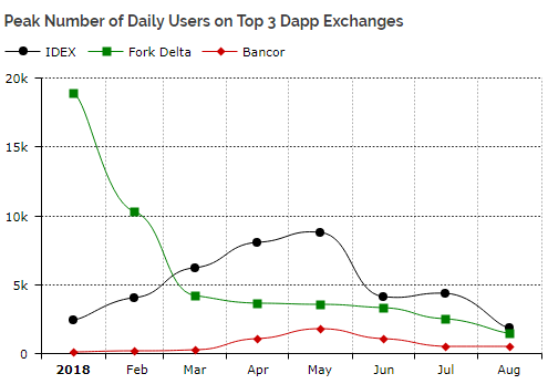 При этом объем принимаемых мерчантами биткоинов в долларовом эквиваленте обвалился на 87% в отношении пика сентября 2017 года. Аналитики обратили свое внимание и на снижение числа пользователей децентрализованных приложений. Так, на графике видно резкое падение аудитории IDEX, Fork Delta, Bancor и Augur.