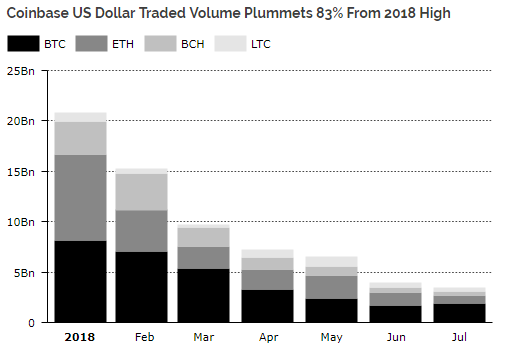 Месячный объем торгов на Coinbase в 2018 году упал на 83%Опубликовано: 7 лет назад Более 50% объемов торгов на криптовалютных рынках обеспечивает пятерка цифровых активов: биткоин, Ethereum, Ripple, Bitcoin Cash и Litecoin. Глубокая коррекция сильно сказалась на биржах, которые оперируют на американском рынке, однако игроки вне США лишь укрепили свои позиции. Об этом говорится в аналитическом отчете для институциональных инвесторов Diar.