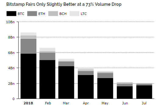 Так, торговые объемы на Coinbase, Bitstamp и Kraken существенно снизились, а вот Binance и OKEx напротив показали рост. При этом с января Coinbase (-83%) и Bitstamp(-73%) демонстрировали почти одинаковую нисходящую динамику, а вот на бирже Kraken годовые максимумы торговых объемов были обновлены в феврале. Аналитики отметили, что именно даунтренд объемов мог вынудить Coinbase открыть «второй фронт», купив децентрализованную биржу Paradex с 19 торговыми парами, включая Binance Coin и Huobi Coin. Одновременно с этим, биржа Binance даже немного улучшила июньские показатели, а OKEx обновила максимумы в июле. Авторы отчета также подчеркнули, что волатильность курса первой криптовалюты достигла минимума 14 месяцев.