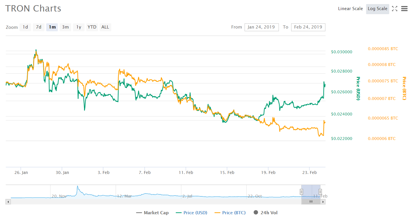 Отметим, впрочем, что с конца января, когда цена TRX превысила $0,03, а капитализация превысила $2 млрд, средневзвешенный курс монеты заметно упал. На момент публикации TRX торгуется в районе $0.0268, капитализация составляет $1,789 млрд. Скачивайте приложение ForkLog для Android! Последние новости рынка криптовалют |