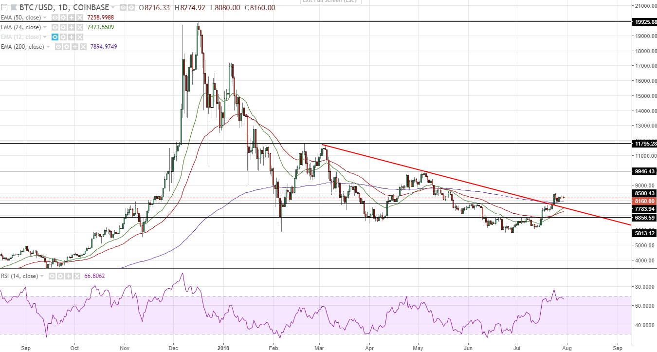 Анализ цен на Bitcoin/Ethereum: Консолидация для продолжения восходящего трендаОпубликовано: 7 лет назад На прошедшей неделе капитализация рынка криптовалют достигала отметки в $303 млрд. (по данным на 25 июля), после чего вновь опускалась к уровню $286 млрд. (27 июля). На момент написания статьи (30 июля) капитализация составляет почти $295 млрд. При этом цена на биткоин двигалась в диапазоне $7783,94-8500,43. Во вторник, 24 июля, цена преодолела важный психологический уровень в $8000, но уже со среды, 25 июля, началась коррекция, в результате которой цена 26 июля достигла уровня в $7840. В частности, коррекцию подкрепила новость о том, что братьям Уинклвосс опять дали отказ в запуске биткоин-ETF. На момент написания статьи цена криптовалюты номер один составляет $8134,98. Вследствие описанного выше движения ценовой график биткоина закрепился выше долгосрочной трендовой линии и в текущий момент консолидируется для продолжения восходящего тренда. Рис. 1 — BTCUSD, Daily В данной ситуации триггером для продолжения роста будет пробитие уровня сопротивления в $8500,43. А следующим сильным уровнем сопротивления станет $9946,43 и психологический уровень в $10 000. О доминировании восходящего тренда говорит закрепление ценового графика выше тяжёлой экспоненциальной средней с периодом 200, а также пересечение быстрой ЕМА24 медленную ЕМА50 снизу вверх. При этом индикатор RSI находится на отметке 70,00, что говорит о высоком уровне перекупленности актива. Это в итоге может продлить консолидацию цены в рамках бокового канала $7783,94-8500,43. EthereumEthereum не показывает такого сильного роста, как биткоин. В текущий момент цена за один ETH составляет $462,90. Ценовой график данной криптовалюты продолжает движение в рамках восходящего канала у его уровня поддержки (нижней границы). Рис. 2 – ETHUSD, Daily При этом присутствует уровень сопротивления $486,02-515,40. В случае пробития и закрепления над ним будет сформировано восходящее движение, которое встретит следующий уровень сопротивления — $547,95. Также важным является уровень поддержки $406,64-432,08. В результате его пробития цена может укрепить нисходящее движение, которое продолжится к отметке $359,00. Присоединяйтесь к инвестиционному журналу в Telegram. TSI Journal — это журнал об инвестициях, аналитике, трейдинге и ICO. Присоединятесь к нам: https://t.me/tsianalytics Егор Тишин, аналитик TSI Analytics, специально для Coinspot Обзор отражает субъективную позицию аналитиков-партнёров Coinspot c учётом личного стиля торговли. Торговые операции с криптовалютой носят повышенные риски ввиду особенностей рынка. Редакция не несёт ответственности за ваши торговые решения и рекомендует торговать только на те средства, потеря которых не будет критичной. Последние новости рынка криптовалют |