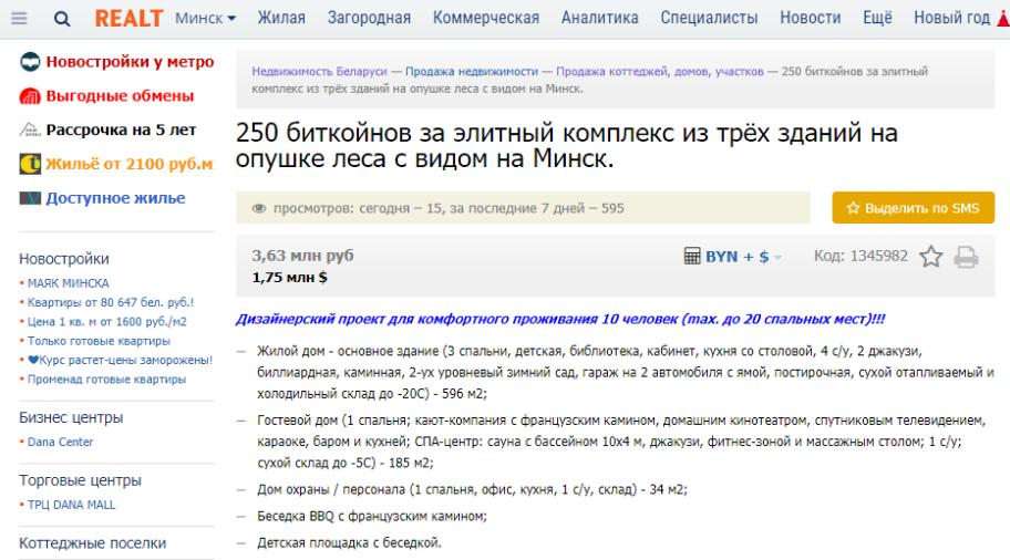 В Беларуси пытаются продать за биткоины элитный домОпубликовано: 7 лет назад Гражданин Беларуси разместил объявление о продаже своего дома за 250 биткоинов. Особняк расположен в элитном посёлке Тарасовка, его площадь составляет 500 квадратных метров, сообщает местный портал Realty.tut.by. ъ Владелец дома подчеркнул, что это не рекламный трюк, он действительно хочет продать своё жилье недалеко от Минска за криптовалюту. При текущем курсе биткоина стоимость дома составляет около $1,6 млн. Владелец пытается продать свой особняк уже два года и только теперь решил изменить условия, переключившись на цифровую валюту. Собственник по имени Алексей, чья фамилия не называется, заявил, что сам владеет криптовалютой и относит себя к сторонникам цифровой экономики. Сейчас его волнует вопрос юридического оформления такой сделки. Для этого он готов привлечь профессиональных юристов, готовых подготовить договор купли-продажи за криптовалюту. Стоит отметить, что Алексей — резидент Парка высоких технологий. В доме, который он продаёт, есть кухня со столовой, кабинет, библиотека, каминная, четыре санузла, три спальни и детская и бассейн. Во дворе находится гараж на два автомобиля, отапливаемый склад и зимний сад. Стоит отметить, что в конце ноября прошлого года в Минске местный житель продавал за биткоины квартиру. Напомним, что в Беларуси полностью легализовали добычу криптовалют и операции с цифровыми активами. Соответствующий декрет подписал президент республики Александр Лукашенко. Последние новости рынка криптовалют |