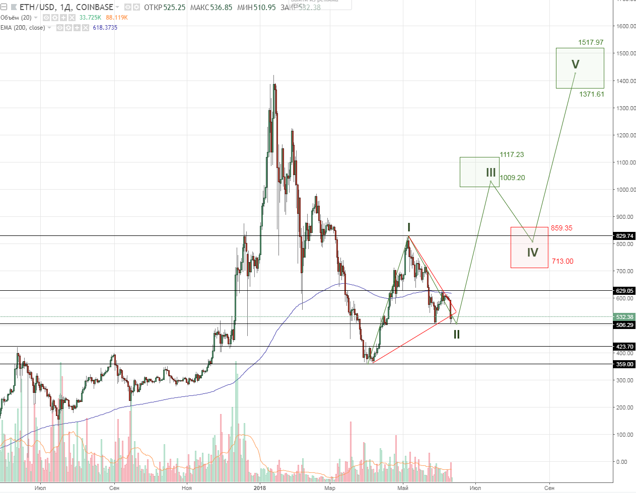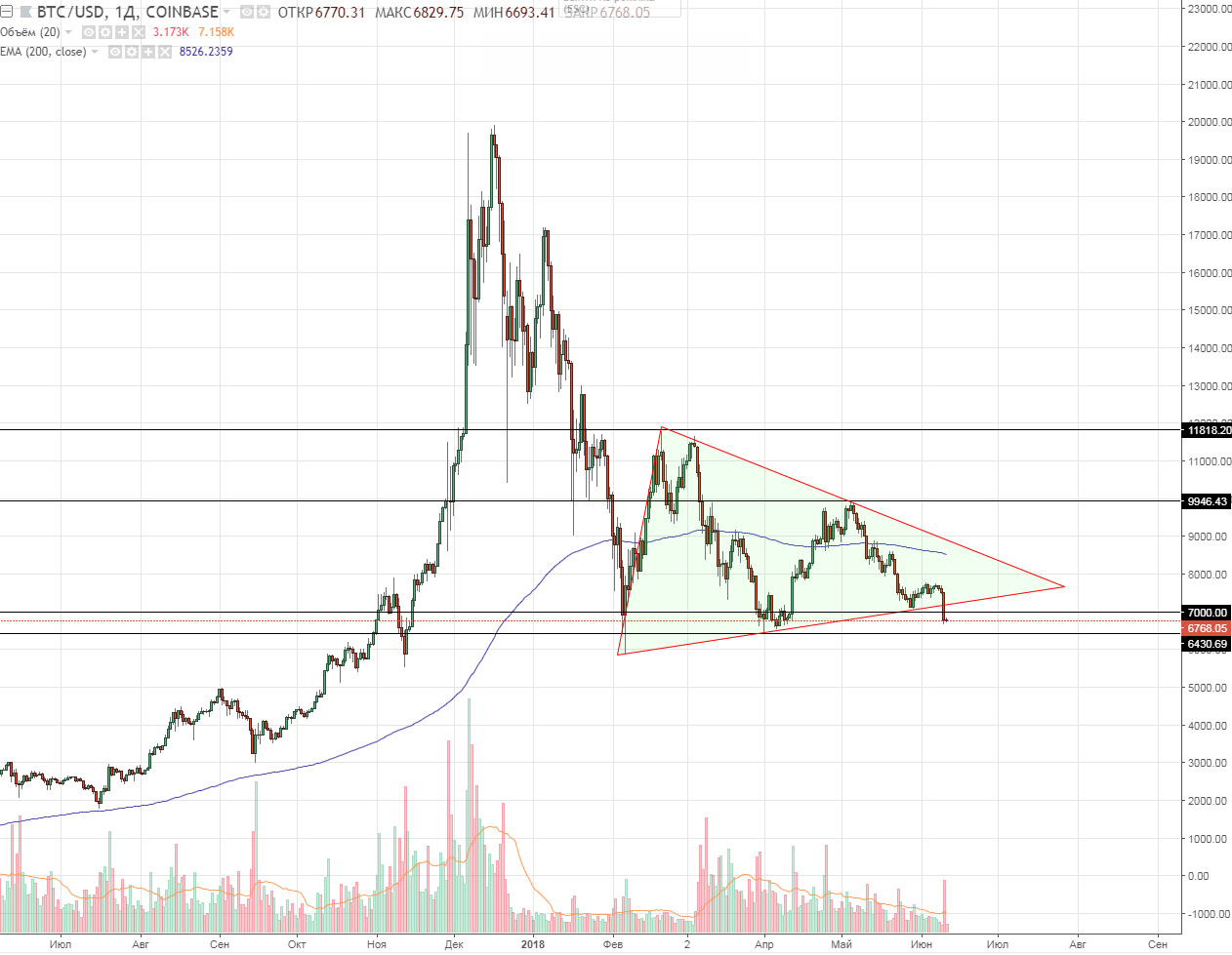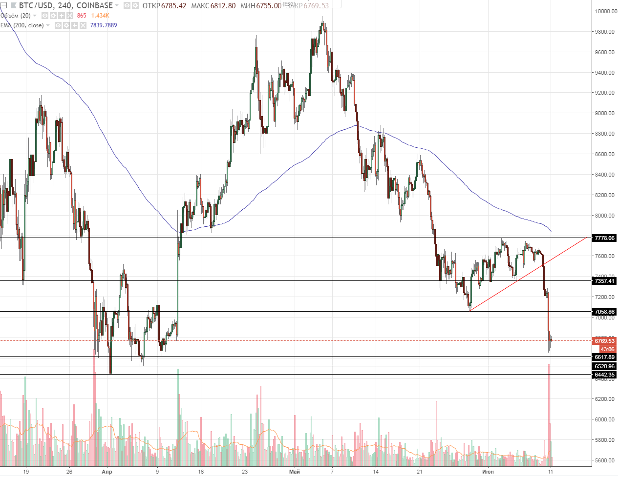 Анализ цен на Bitcoin/Ethereum: доминирование медвежьих настроений (11.06.2018)Опубликовано: 7 лет назад С 9 июня на рынке криптовалют началось сильное падение. Так капитализация крипторынка снизилась с $345.3 млрд. (09.06.2018) до $298.1 млрд. (11.06.2018). На момент написания статьи (11.06.2018) доля Bitcoin на рынке составляет 38.9% ($116.1 млрд.). За время этого падения цена на главную криптовалюту, Bitcoin, опустилась ниже $7000.00 и на момент написания статьи торгуется на отметке $6793.91, по данным сайта Coinmarketcap. Многие сходятся во мнении, что данное падание было во многом вызвано реакцией на требование предоставления информации о трейдинговых операциях платформ Bitstamp, Coinbase, Kraken и itBit от Комиссии по срочной биржевой торговле США (CFTC). Исходя из анализа ценового графика можно утверждать о сильном закреплении медвежьего тренда, после фиксации цены ниже $7000.00. Рис. 1 — BTCUSD, Daily На протяжении недавнего нисходящего импульса цене также удалось пробить и закрепится под нижней границей треугольника (уровнем поддержки), что может сообщать о продолжении нисходящего движения к уровню $6442.35. В случае закрепления под этим уровнем ($6442.35) цена может продолжить падение к отметке в $5000.00. Важно упомянуть о том, что доминирование бычьих позиций также подтверждает значительное увеличение торговых объемов. На четырёхчасовом таймфреме стоит отметить движение цены к трем важным уровням поддержки: $6617.89, $6520.96, $6442.35, последний в свою очередь является двухмесячным минимумом. Рис. 2 – BTCUSD, H4 Если же цена закрепится на уровне $6617.89 — $6442.35, может начаться долгий и изнурительный боковой тренд (флет), а пробитие указанных уровней и закрепление над или под ними ознаменует новое движение (в случае закрепления под $6442.35 – нисходящее, а в случае обратного закрепления над уровнем $6617.89 — восходящее). Исходя из всего выше сказанного, можно сделать вывод, что медведи вновь взяли инициативу в свои руки и не дали быкам вывести ценовой график к верхней границе треугольника. В данный момент в краткосрочной перспективе следует ожидать продолжения падения к уровню $6500.00, на котором и решится долгосрочная перспектива, в рамках которой худшим вариантом станет цель на $5000.00. Стоит отметить, что рынок в похожих ситуациях очень восприимчив к любого рода фундаментальным изменениям, а значит может отреагировать и изменить свое направление на фоне какого-нибудь благоприятного новостного фона. ETHUSDВ след за главной криптовалютой началось и падение цены Ethereum, которая за последние 7 дней снизилась на 12.5%. На момент написания статьи (11.06.2018) Ethereum торгуется на уровне $534.86, а его доля на крипторынке составляет почти 18%. Так криптовалюта встретила сильное сопротивление на уровне $629.05, где также находится тяжелая ЕМА200. После чего началось нисходящее движение в рамках котрого цена закрепилась под уровнем поддержки $600.00 и сформировала нисходящий импульс к $506.29, в контексте которого ей удалось закрепится ниже уровня поддержки треугольника. Это значительно укрепило бычьи позиции на рынке. Рис. 3 – ETHUSD, Daily Несмотря на все это последний нисходящий тренд можно ещё рассматривать как вторую коррекционную волну Эллиота, логичным завершением для которой станет уровень $500.00, после чего следует ожидать перехода в третью волну с целью $1117.23 — $1009.20. Ситуация для Ethereum выглядит не так критично, как для его старшего брата Bitcoin. Для этой криптовалюты также не наб