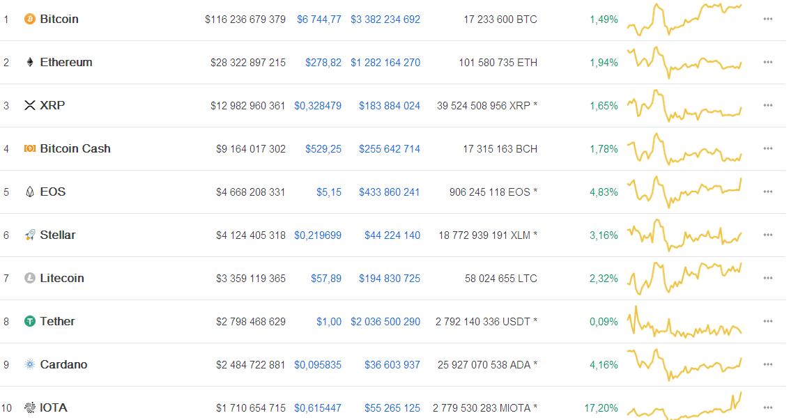 IOTA на взлёте: монета попала в ТОП-10 рейтинга CoinMarketCapОпубликовано: 7 лет назад В понедельник, 27 августа, криптовалюта IOTA стала стремительно расти в цене и попала в десятку крупнейших цифровых активов рейтинга CoinMarketCap. За последние 24 часа монета подорожала почти на 12% до $0,61. На момент публикации этого обзора рыночная капитализация криптовалюты достигла $1,71 млрд. При этом на прошлой неделе монета торговалась на уровне $0,5, сообщает портал Hacked.com. В ночь на понедельник криптовалюта смогла подняться на 10-строчку рейтинга CoinMarketCap. Отметим тот факт, что в течение августа IOTA стала худшим альткоином, упав в цене за месяц более чем на 36% до $0,4. Большинство экспертов связало падение курса этой криптовалюты с общей негативной динамикой цифрового рынка. Но после того, как японский IT-гигант Fujitsu объявил о сотрудничестве с командой IOTA в сфере автоматизации производственных процессов, стоимость криптовалюты стала расти. Топ-менеджмент Fujitsu хочет использовать блокчейн-продукты IOTA в своей работе, включая сеть для хранения и передачи информации. Один из топ-менеджеров корпорации Леопольд Штернберг подчеркнул, что блокчейн-платформу IOTA можно использовать в обрабатывающей промышленности для контроля за цепочками поставок и обмена данными между предприятиями. Курс монеты систематически начинает расти после запуска очередного продукта криптокомпании или заключения соглашения о партнерстве с банками или корпорациями. Например, в конце мая этого года IOTA подорожала на 15% после запуска криптокошелька Trinity. Последние новости рынка криптовалют |