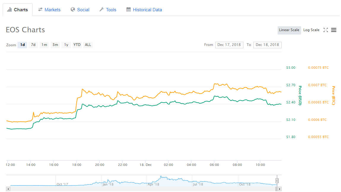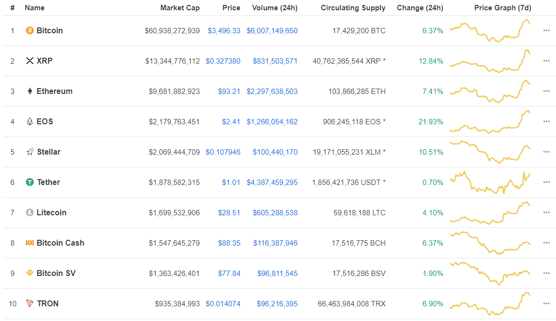 $EOS поднялся по капитализации на 4-е месте в рейтинге CoinMarketCapОпубликовано: 7 лет назад Криптовалютный рынок встречает вторник, 18 декабря, в несколько приподнятым настроением. Его причиной стал уверенный рост биткоина в понедельник вечером, по итогам которого цена биткоина за короткий отрезок времени поднялась выше $3500 (более чем на 6% за 24 часа) и дальнейшие попытки сломить сопротивление на небольшом уровне выше. Однако абсолютным лидером на этом отрезке неожиданно стал EOS – в утренние часы вторника цена этой криптовалюты поднималась выше $2.50 – почти на 30% выше показателей прежнего дня. Капитализация EOS при этом превысила $2,4 млрд, и это четвертый в настоящий момент показатель в рейтинге популярного аналитического ресурса CoinMarketCap. Перед этим EOS находилась на 8-м месте, подвинув таким образом вниз Litecoin, Tether и Stellar. Ripple (XRP) с $13,3 млрд и Ethereum ($9,68 млрд) продолжают занимать 2-е и 3-е места соответственно. 8-и 9-е место занимают теперь Bitcoin Cash и Bitcoin SV, однако в спину им смотрит TRON, который замыкает первую десятку. Отметим, что позитивные настроения на рынке за последние часы повысили совокупную капитализацию криптовалют до $112,1 млрд, из которых 54,3% ($60,4 млрд) приходятся на биткоин. По состоянию на 10:00 UTC средневзвешенный курс BTC составлял $3500. Последние новости рынка криптовалют |