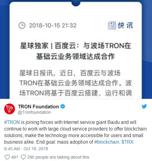 TRON и Baidu будут сотрудничать в сфере блокчейна и облачных технологийОпубликовано: 7 лет назад Криптовалютная компания TRON Foundation официально подтвердила информацию о сотрудничестве с китайским IT-гигантом Baidu. Как уточняет Oracle Times, стороны будут взаимодействовать в сфере запуска проектов с использованием облачных и блокчейн-технологий. Ранее лидер команды TRON Foundation Джастин Сан намекнул в Твиттере на грядущее партнёрство его компании с неким крупным технологическим предприятием. После этого в сети появились многочисленные сообщения о том, речь идёт об интернет-компании Baidu, которую часто называют «китайским Google», так как она контролирует более 60% всех поисковых запросов в китайском сегменте интернета. Отметим, что команда TRON Foundation не стала называть сотрудничество с Baidu партнёрством, ограничившись термином «взаимодействие». В заявлении TRON в Твиттере сообщается, что вместе с Baidu компания планирует ускорить работу по распространению блокчейн-направления во всём мире и что это поможет бизнесу на разных этапах его развития. Интерес Baidu к блокчейну отмечался ещё в прошлом году. Тогда в компании заявляли, что потенциал применения технологии распределённого реестра очень высок: если грамотно использовать такую технологию, она поможет автоматизировать любое направление в бизнесе. Последние новости рынка криптовалют |