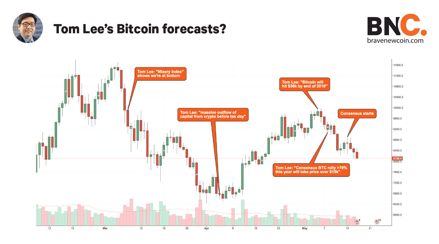 Том Ли признал провал своего биткоин-прогнозаОпубликовано: 7 лет назад Трудно точно предсказать, сколько актив будет стоить через неделю, не говоря уже о том, что произойдёт через месяц или год. Признать ошибку также нелегко. Том Ли, главный исследователь компании Fundstrat Global Advisors, откровенно признал, что его последний биткоин-прогноз не сработал, за что заслуживает уважения. 7 мая он предсказывал, что после конференции Consensus 2018 начнётся значительный рост цены биткоина (биткоин-ралли). Конференция по блокчейну и криптовалютам проходила на этой неделе в Нью-Йорке на Манхэттене и привлекла тысячи энтузиастов. Однако ралли биткоина не произошло. В своём отчёте для клиентов Ли признался, что в течение уходящей недели криптовалюты испытали резкое снижение на 10%. Он написал: Такие конференции, как Consensus, представляют собой шанс для сообщества собраться в централизованном месте и встретиться с новыми участниками растущего сообщества. Естественно, такое сочетание «здравого смысла», когда прогресс движется вперёд, и «нового интереса», когда аудитория участников растёт, должно усилить уверенность криптовалютного сообщества. Всё это также должно было способствовать росту цен. Что же пошло не так? Ли говорит, что криптовалютная индустрия по-прежнему нуждается в большей ясности со стороны таких регуляторов, как Комиссия по ценным бумагам и биржам США (SEC), а также в большем признании криптовалют традиционными компаниями. Он отмечает: Криптовалюты по-прежнему сталкиваются со значительным внутренним сопротивлением и препятствиями со стороны традиционных финансовых институтов. Обнадёживает то, что значительную долю новых участников [Consensus] составляют финансовые учреждения. Компания Fundstrat всё ещё надеется, что к концу этого года биткоин вырастет до $25 000. Предсказания движения курса биткоина от Тома Ли в разное время, источник bravenewcoin Читайте также: Объективность превыше всего, или Чьим прогнозам цены биткоина можно доверять Последние новости рынка криптовалют |