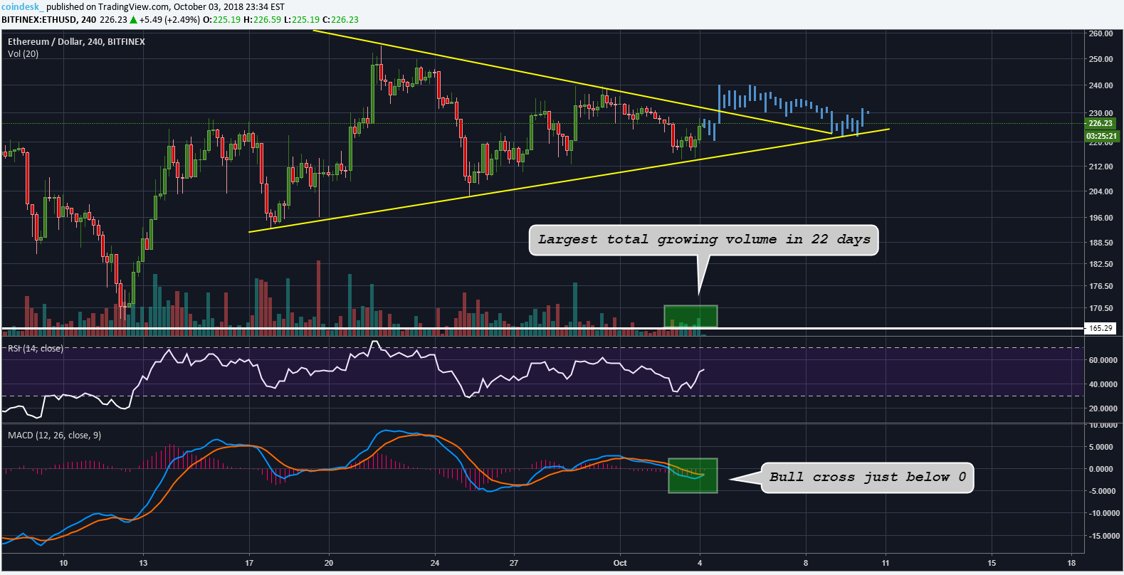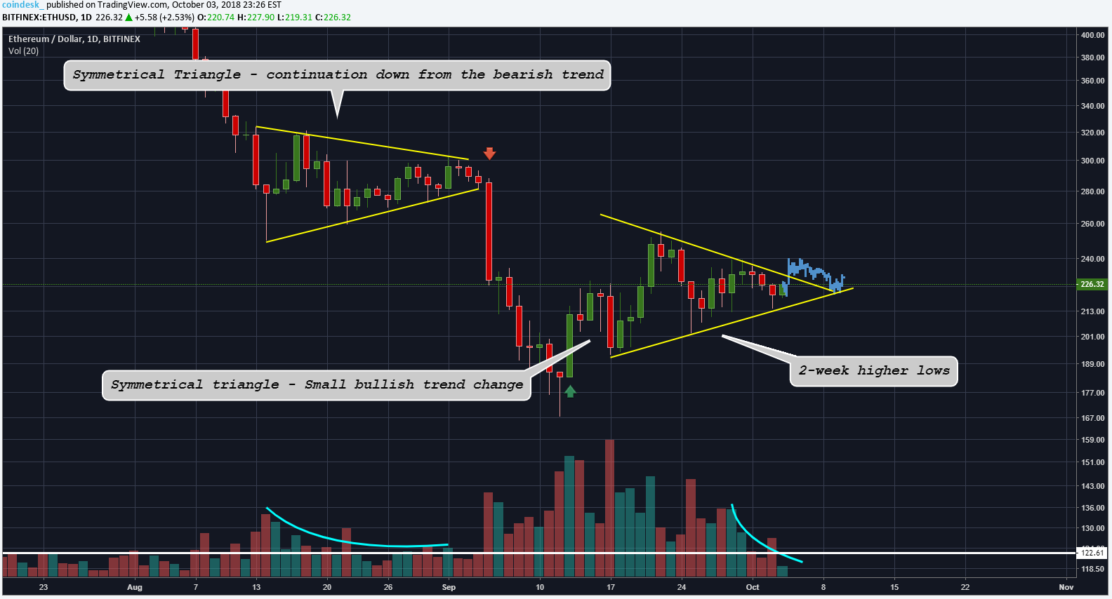 Мнение: цена Ethereum готовится к восходящему движениюОпубликовано: 7 лет назад Аналитик CoinDesk Себастьян Синклер уверен, что продолжающееся на протяжении последних двух недель умеренное восстановление цены Ethereum продолжится и вскоре быки протестируют отметку $240. Медведям не удалось разрушить линию поддержки, проведенную по минимумам от 17 и 25 сентября. В то время криптовалюта ETH «умудрилась» даже оказаться на третьей ступеньке рейтинга CoinMarketCap на фоне недолгого ралли XRP. На момент написания материала Ethereum торгуется в районе $225. Дневной графикВ последнее время диапазон цены сужался и Ethereum сформировал фигуру «симметричный треугольник», который в данном случае можно трактовать как паттерн продолжения тренда. На этом же графике можно увидеть, что августовский симметричный треугольник также оказался паттерном продолжения тренда — после пробоя его нижней границы Ethereum обновил минимум 2018 года. Поскольку накануне появления последнего симметричного треугольника цена двигалась вверх, то можно предположить, что в этот раз будет пробита именно верхняя граница фигуры. В обоих случаях видно, как на фоне консолидации цены снижались объемы торгов. Четырехчасовой графикНа младшем таймфрейме в последнее время наблюдается некоторое увеличение объемов торгов, которые в какой-то момент достигли значений середины сентября. На этом фоне линии индикатора MACD пересекают нулевую отметку. Все это говорит о растущей вероятности восходящего выхода цены из сужающегося диапазона. Однако закрытие дневной свечи ниже отметки $214 может «поставить крест» на бычьей формации из верхних минимумов (higher low) и на вероятности завершения медвежьих настроений, которые длятся уже 10 месяцев. Напомним, в прошлом месяце Себастьян Синклер предположил, что отметка $8500 завершит нисходящий тренд биткоина. Последние новости рынка криптовалют |