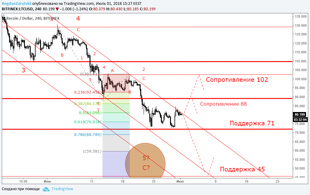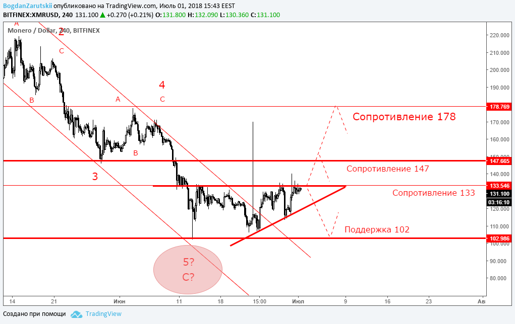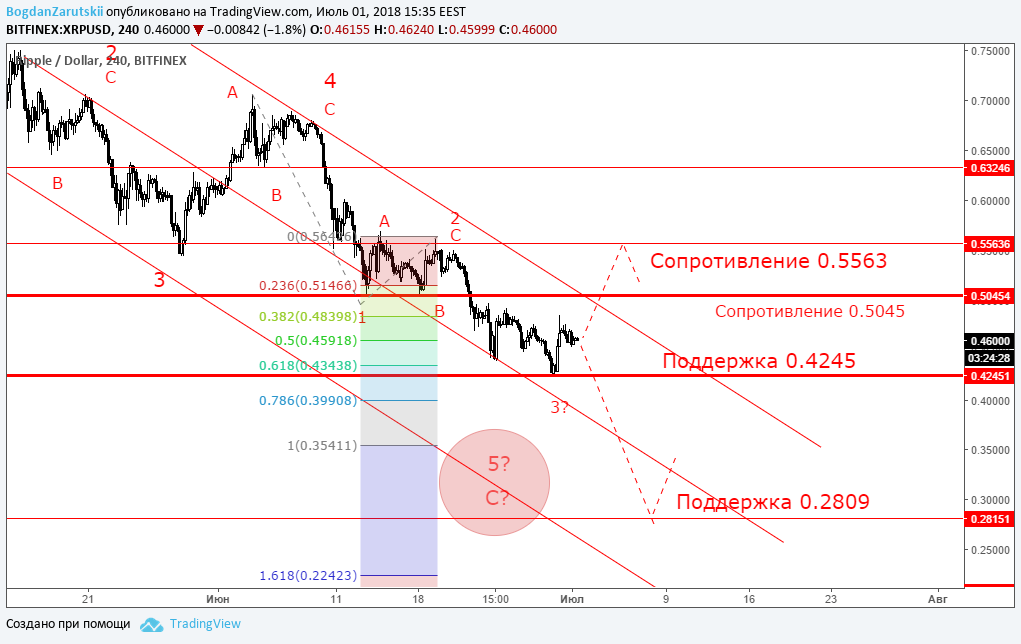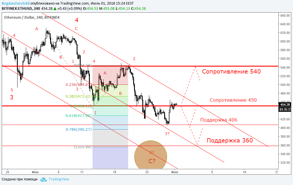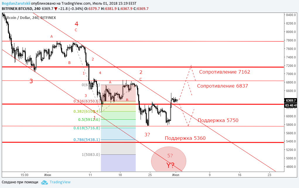 Минувшая неделя отметилась разносторонней динамикой торгов. В частности, биткоин под конец недели не смог преодолеть минимум от 24 июня, что технически служит положительным сигналом, а в ночь на 30 июня рынок совершил заметный отскок вверх, причем эфир и лайткоин попытались преодолеть ближайшие максимумы. В целом сформировалась картина, когда монеты оказались перепроданными и на фоне умеренно положительного новостного фона создались предпосылки в сторону покупок. Вопрос только в том, насколько хватит сил у «быков» пойти против устоявшегося тренда, если капитализация рынка еще держится ниже $300 млрд, а в момент написания статьи отметка держалась на уровне $256 млрд. Новостной фон на этой неделе порадовал участников рынка. Стало известно, что Южная Корея инвестирует $200 миллионов в развитие блокчейна. А дополнительным драйвером роста популярных монет послужило сообщение, что Южная Корея не будет облагать 10% налогом прибыль от криптовалют. Дополнила оптимизм новость о том, что бирже Bithumb удалось почти вдвое уменьшить потери, связанные с недавним взломом. Однако сложно судить, какая новость была решающей и позволила развернуть криптовалюты от очередного минимума. Кроме того, на рынке успела сформироваться устойчивая тенденция к пессимизму - в частности, многие трейдеры восприняли резкий взлет биткоина (почти на $700 за одну ночь) как очередную манипуляцию, после которой начнется новая волна падения. А теперь технический анализ: BTC/USD (H4): выход из тренда?Биткоин (BTC) пытается выйти за рамки нисходящей тенденции. Вместе с тем, «цифровое золото» находится ниже уровня сопротивления в районе $6837 и $7162, что технически «давит» на криптовалюту и застявляет ее дальше снижаться. Таким образом, продолжение негативного сценария видится как вполне вероятная перспектива на следующей неделе. Первая цель, куда биткоин может дойти в случае снижения - это минимум прошлой недели в районе $5750. Если и этот уровень будет пройден, тогда откроется перспектива снижения до следующей поддержки в районе $5360. Что касается волновой теории Эллиотта, то по-прежнему в центре внимания развитие последней пятой волны. До сих пор наблюдается развитие внутренней волновой структуры, которая поддерживает движение биткоина по нисходящему тренду с целью до $5360. Положительный сценарий для биткоина - это попытка преодолеть важный уровень сопротивления в районе $6837. ETH/USD H4: в районе важного уровняЭфир (ETH) развернулся от минимума в районе $406, что служит положительным сигналом. Кроме того, данная криптовалюта находится в рамках нисходящей тенденции, что технически может создать еще одну волну снижения. Таким образом, мы сохраняем прогноз при неблагоприятном сценарии: достижение поддержки в районе $360. Также влияет на продажи и нахождение монеты в районе $450, раньше график цены неоднократно тестировал данный минимум. Поэтому есть еще одно основание полагать, что ситуация для эфира пока что в пользу снижения. При этом только уверенное закрепление выше $450 даст сигнал на прохождение линии сопротивления нисходящего тренда. Волны Эллиотта также поддерживают нисходящее движение. На данный момент видно развитие внутренней волновой структуры в пользу последней импульсной волны. LTC/USD H4: разворот от поддержкиЛайткоин (LTC) приблизился к уровню поддержки в районе $71. В случае его пробоя о