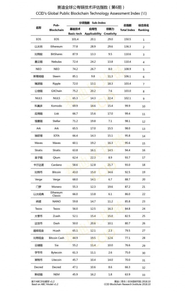 Шестое место в новом рейтинге аналитики отдали Ripple — это самый высокий показатель для монеты в рейтинге CCID. По критерию «технология» первые места получили те же криптовалюты, что и в прошлом месяце: EOS, Bitshares, Steem, Ethereum и Gxchain. В категории «применение» лучшими оказались Ethereum, Neo, Nebulas, Qtum и Dash. Сообщается, что при составлении этого списка аналитики «улучшили методы оценки инструментов разработчиков и в полном объеме изучили API, SDK, RPC, смарт-контракты и прочие факторы». Несмотря на то, что биткоин опустился в рейтинге, он в компании с Ethereum, EOS, Nuls и Cardano стал лидером в категории «инновации».