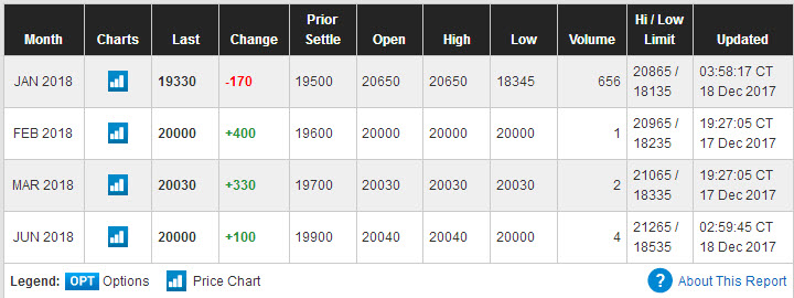 В ночь на понедельник на Чикагской товарной бирже (CME) были открыты торги фьючерсами на биткоин с погашением в январе, феврале, марте и июне 2018 года. Практически сразу после старта торговли по январским контрактам на отметке $ 20 800, цена начала падать и достигла минимума в $18 800, скорректировавшись к моменту публикации до $19 300. Впрочем, падение на 4% считается незначительным для мира криптовалют. Более длительные контракты сейчас держатся у отметки $20 000. Однако, объем заключенных контрактов на январь пока не очень значителен даже по меркам криптовалютных бирж. На январь 2018 года сейчас открыто 656 контрактов. С учетом того, что номинал каждого составляет 5 BTC, в сумме это всего лишь 3280 BTC, то есть в несколько раз меньше дневного оборота ведущих криптовалютных бирж. Объемы более длительных контрактов и вовсе не стоят внимания.