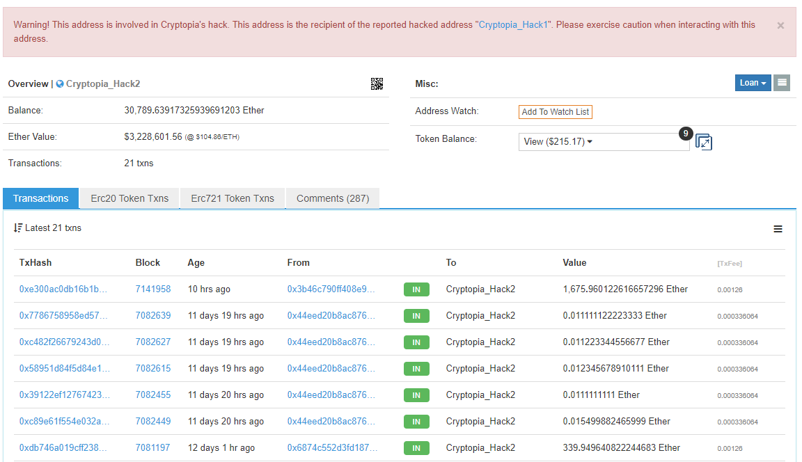 Аналитики Elementus: злоумышленники вывели из Cryptopia еще 1675 ETHОпубликовано: 7 лет назад Специалисты фирмы Elementus, ранее оценившие ущерб от атаки на Cryptopia в $16 млн, сообщили о возобновлении вывода хакерами средств из биржи. По мнению исследователей, кошельки по-прежнему остаются уязвимыми. Сегодня, 29 января, неизвестный злоумышленник вывел еще 1675 монет Ethereum (более $175 тысяч по текущему курсу) из примерно 17 тысяч кошельков Cryptopia. Среди них — 1948 кошельков, отнесенных компанией в категорию «подверженные риску» и 5240 кошельков, которые начали опустошаться еще в ходе прошлой атаки, но затем пополнялись пользователями. Последние, вероятно, не знали о произошедшем. Украденные из биржи средства продолжают поступать на следующий ETH-адрес: По мнению аналитиков, в отличие от хакера, сотрудники Cryptopia уже не контролируют приватные ключи от кошельков Ethereum. Также, невзирая на продолжающуюся атаку, неосведомленные пользователи продолжают депонировать средства на биржу. В последнем твите представители Cryptopia утверждают, что в настоящее время правоохранительные органы продолжают расследовать инцидент. При этом у руководства биржи нет доступа к средствам, а точную сумму потерь пока установить невозможно.