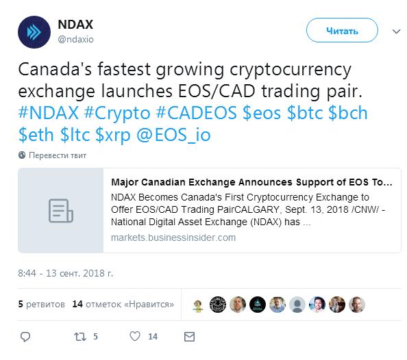 Биржа NDAX запустила торги EOS в паре с канадским долларомОпубликовано: 7 лет назад Крупнейшая канадская криптовалютная биржа NDAX приступила к обслуживанию операций с цифровыми монетами EOS. Торги будут производиться в паре с канадским долларом, говорится в заявлении пресс-службы торговой площадки в Twitter. NDAX стала первой криптобиржей в Канаде, запустившей операции по купле-продаже EOS. Теперь пользователям платформы доступны операции с этой криптовалютой, а также с биткоином, лайткоином, эфиром, Ripple и Bitcoin Cash. Операции с EOS будут производиться по той же схеме, что и с другими цифровыми активами. Безопасность и оперативность каждой транзакции будет на самом высшем уровне, подчеркнула администрация NDAX. Эта платформа пользуется популярностью у канадских криптовалютных трейдеров не только из-за расширенных возможностей трейдинга, но и из-за низких транзакционных сборов, которые теперь будут уменьшены с 0,3 до 0,2%. По последней информации с торговых площадок, средний курс монеты EOS сейчас прибавляет и уже превысил $5,2, а её рыночная капитализация достигла $4,7 млрд. Криптовалюта положительно отреагировала на запуск торгов на канадской бирже и продолжает демонстрировать рост. Отметим, что эту же монету включают в список обслуживаемых позиций некоторые аппаратные кошельки, что говорит о её популярности. Последние новости рынка криптовалют |