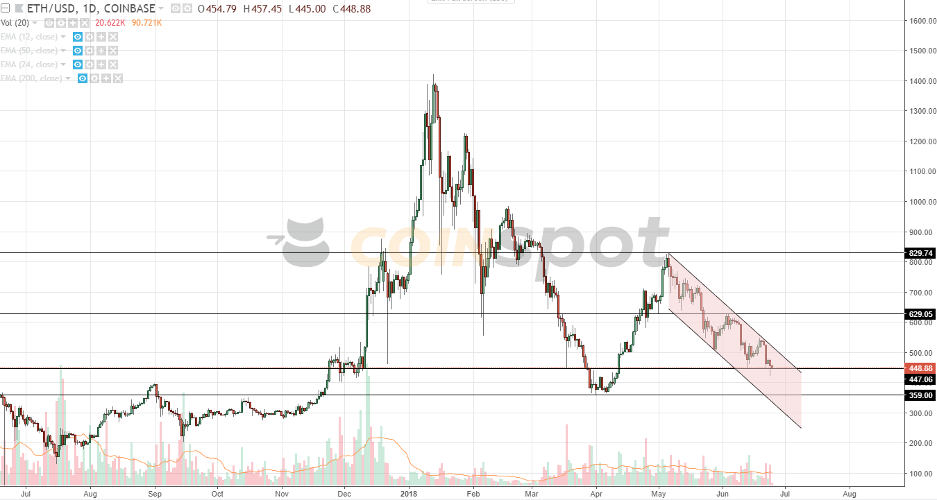 Анализ цен на Bitcoin/Ethereum: Переломный моментОпубликовано: 7 лет назад Прошедшая неделя продолжила тенденцию падения криптовалютного рынка. Так, начиная с 19 июня, капитализация крипторынка снизилась на 14,6% (c $294,2 млрд. до $254,6 млдр.). В свою очередь, цена первой криптовалюты снизилась до февральских минимумов и составляет $6178,00 (на момент написания статьи). BitcoinЦена биткоина пробила важный психологический уровень сопротивления $6000.00, после чего, достигла минимального значения $5800.00. Рис. 1 – BTCUSD, Daily В текущей ситуации цена тестирует горизонтальный уровень поддержки $5867,99, закрепление под которым начнет движение к $5000,00. Несмотря на это, в данной ситуации можно также ожидать отскока цены от выше указанного уровня сопротивления и начала восходящего движения к линии тренда (черная наклонная линии на рис. 1), которая является сильным уровнем сопротивления. Становится понятно, что для формирования бычьего тренда, цене сначала придётся закрепиться выше этого наклонного уровня. В этом контексте, важными уровнями станут $6900,00 – $7000,00, $7776,49. EthereumЦена криптовалюты Ethereum также характеризуется медвежьими настроениями. Так, с прошедшей недели цена упала с почти $500,00 до $421,68, после чего произошел откат к уровню $450,00. График продолжает движение в нисходящем наклонном канале, границы которого служат уровнями поддержки и сопротивления. Рис. 2 – ETHUSD, Daily Логичным, в сложившейся ситуации, будет закрепление цены ниже отметки $447,06, после чего продолжение к уровню поддержки $359,00. Научитесь самостоятельно анализировать крипторынок на вебинаре по ссылке. Анализ цен на Bitcoin/Ethereum провёл аналитик TSI Analytics Егор Тишин. Обзор отражает субъективную позицию аналитиков-партнёров Coinspot c учетом личного стиля торговли. Торговые операции с криптовалютой носят повышенные риски ввиду особенностей рынка. Редакция не несет ответствbенности за ваши торговые решения и рекомендует торговать только на те средства, потеря которых не будет критичной. Безошибочные предсказания движения рынка от инсайдера Coinspot. Последние новости рынка криптовалют |