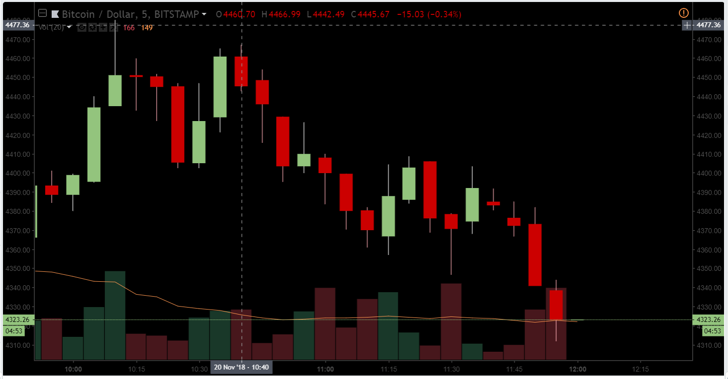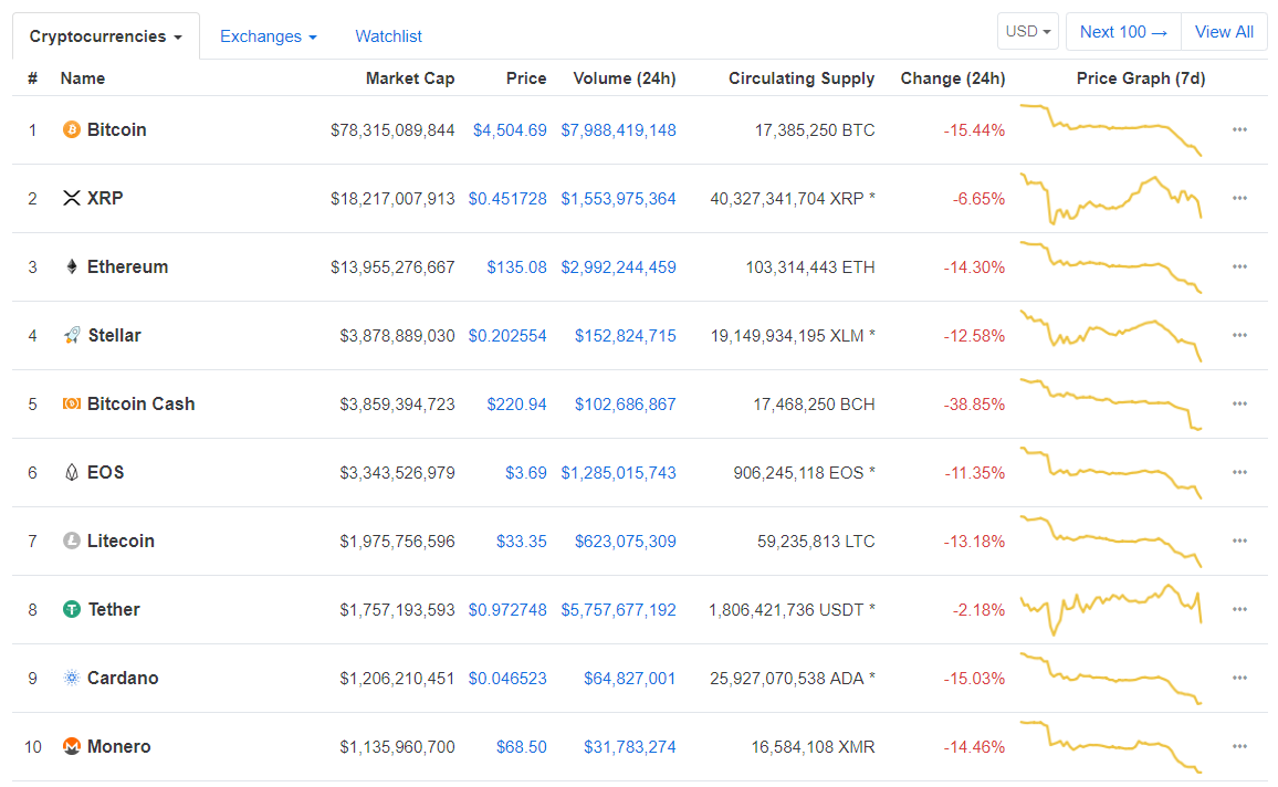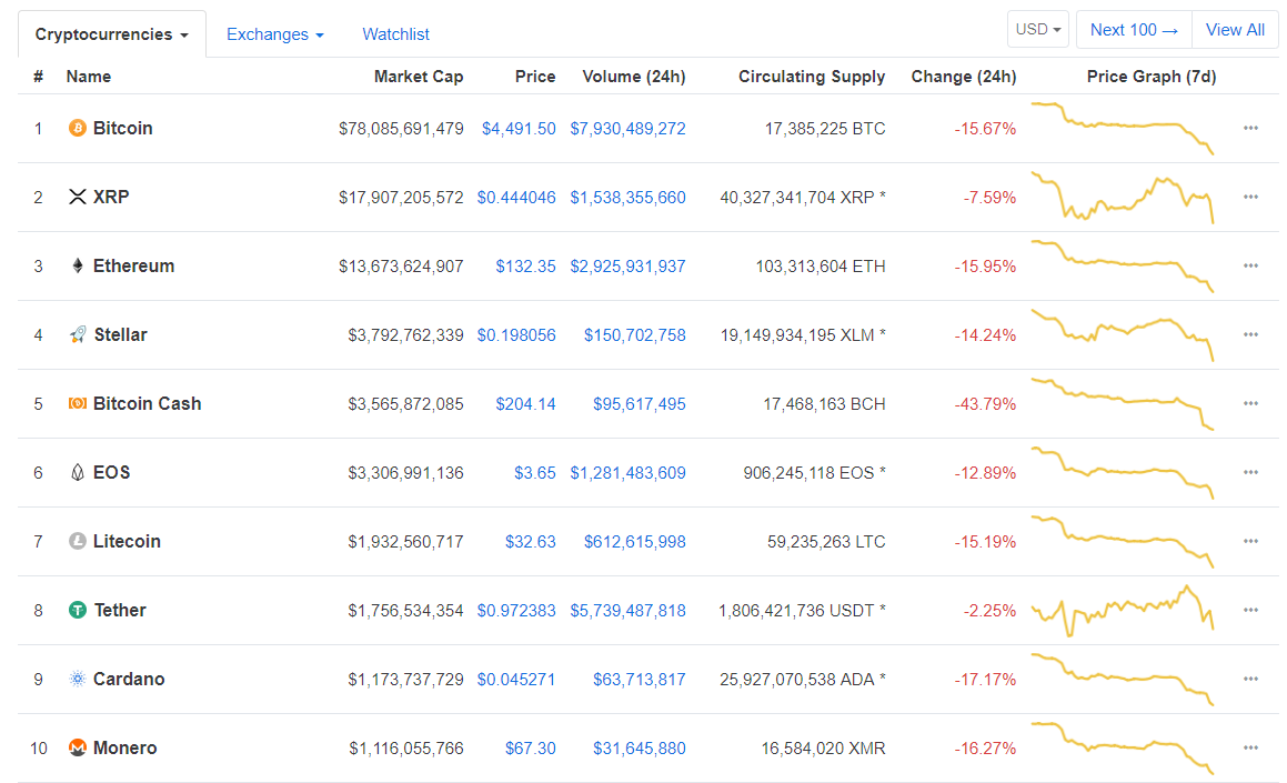 Напомним, ранее WhalePanda заявил, что большинству лучше вообще не торговать криптовалютами, поскольку 90% трейдеров потеряют свои деньги, 5% выйдут в ноль и только оставшиеся 5% смогут заработать. 11:00 UTC По состоянию на этот час рынок несколько стабилизировался. На Bitstamp биткоин торгуется в районе $4400, Coinbase — $4382, Kraken — $4393, Bitfinex — $4593, Bittrex — $4591. Капитализация биткоина — $78,6 млрд, всего рынка — $147,1 млрд. 10:50 UTCВ комментарии изданию Blokt CEO Genesis Trading Майкл Моро заявил, что определенный тип инвесторов впервые начинает покидать криптовалютный рынок: