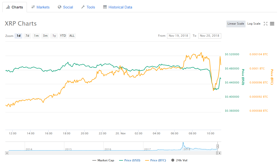 09:25 UTC: Отметим, что второе место по капитализации удерживает Ripple (XRP). Потери XRP кажутся незначительными на фоне остальных монет (-5% на данный момент), а по капитализации этот актив обходит Ethereum почти на $5 млрд. Любопытное мнение высказал в понедельник ведущий программы «Crypto Trader» CNBC Ран Нойнер. По его словам, если снижение биткоина будет продолжаться такими темпами, а XRP продолжит демонстрировать нынешнюю динамику, к пятнице XRP выйдет на первое место по капитализации.