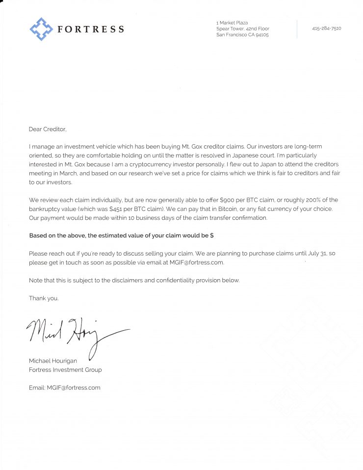 Претензии кредиторов Mt.Gox будут выкуплены по $900 за биткоинОпубликовано: 6 лет назад Инвесторы обанкротившейся криптовалютной биржи Mt.Gox смогут получить по $900 за каждый биткоин, оставленный ими на площадке. О готовности провести соответствующие выплаты заявила инвестиционная группа Fortress. Об этом сообщает CoinDesk со ссылкой на письмо управляющего директора компании Майкла Хоригана.